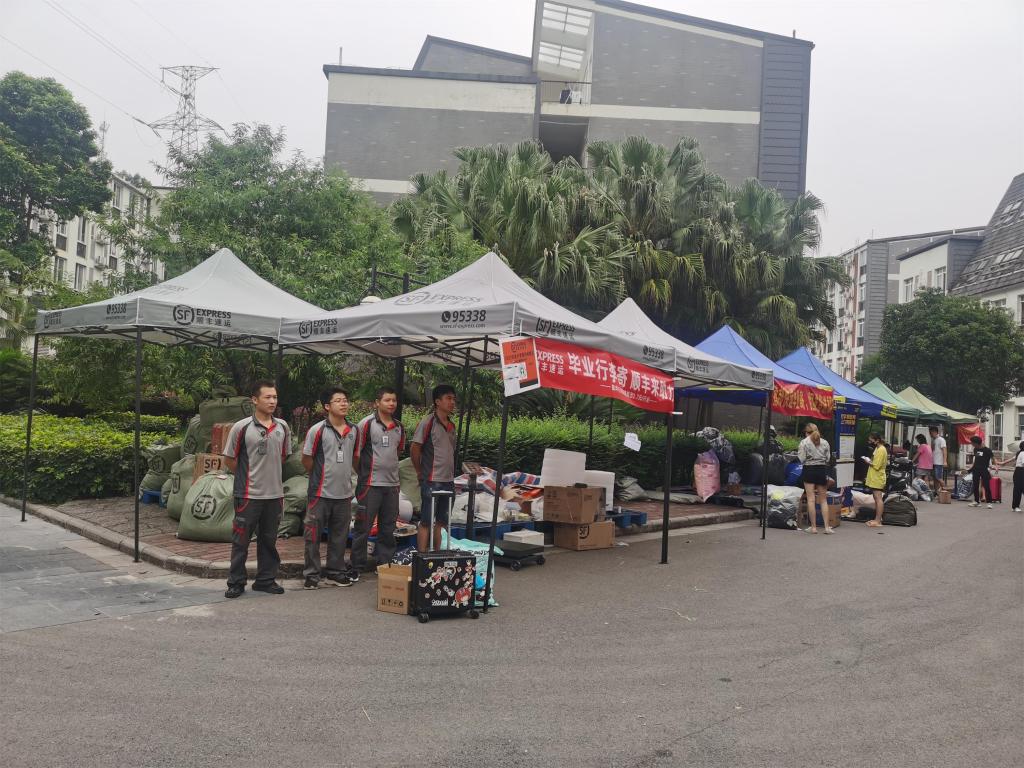 为助力本届毕业生顺利离校,物业公司本着服务师生的宗旨,6月初就提前规划、安排部署、市场调研,积极沟通,最终选定中国邮政、顺丰速运、德邦快递三家快递公司,以最大的优惠力度,为学生提供便捷、优质服务,时刻要求快递公司严格执行校园疫情防控的出入管理,定点消杀,提前准备帐篷、塑料布、垫箱及厢式大货车等遮挡工具,防止汛期雨天淋湿包裹,确保行李安全、完好。