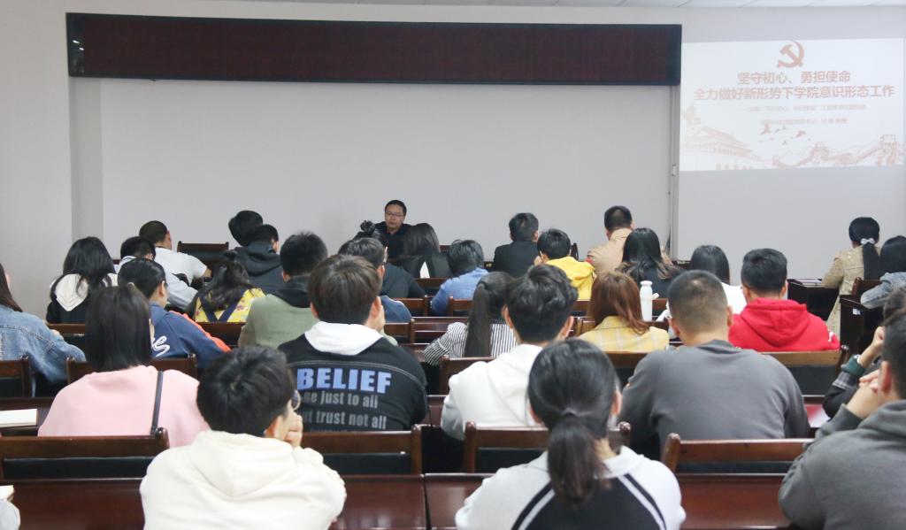 10月25日下午,学院党委书记甘勇在办公楼302会议室做了主题为“坚守初心、勇当使命——全力做好新形势下学院意识形态工作”主题教育专题党课。学院机关一直属党支部、设计系教工党支部、设计系第一、第二学生党支部全体师生党员参加了此次党课学习。