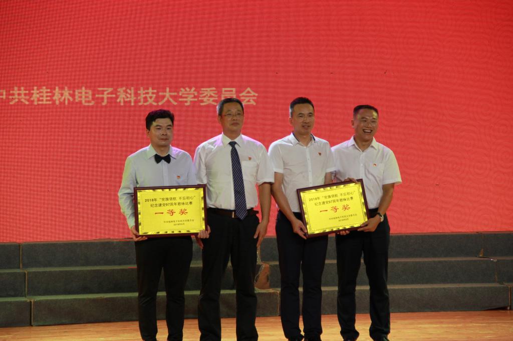 6月29日晚上,桂林电子科技大学在会议中心大礼堂举行的“党旗领航,不忘初心”纪念建党97周年歌咏比赛暨表彰大会中,我校选送的节目《梦想星光》在所有参赛的23个优秀节目中脱颖而出,以全场最高分荣获一等奖。