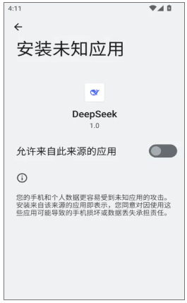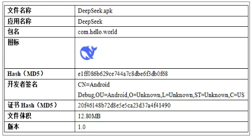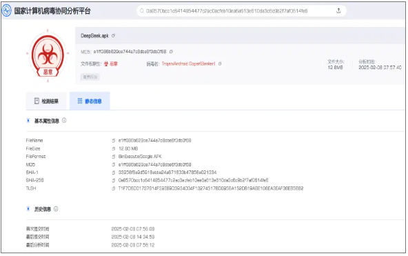 近日,国家计算机病毒应急处理中心和计算机病毒防治技术国家工程实验室依托国家计算机病毒协同分析平台在我国境内捕获发现针对我国用户的仿冒我国国产人工智能大模型“DeepSeek”官方APP的安卓平台手机木马病毒,如图1、图2所示。