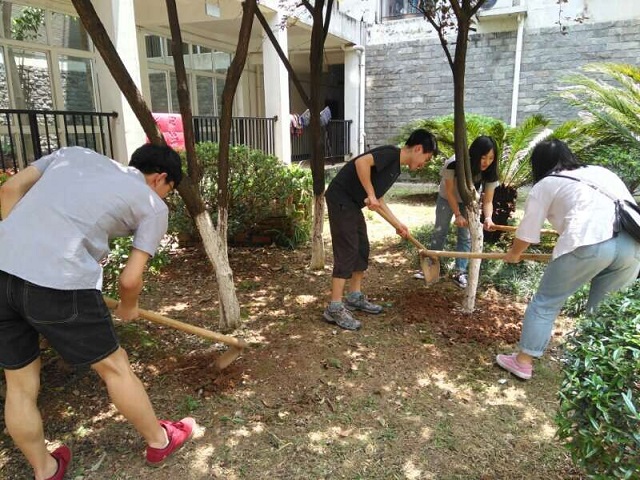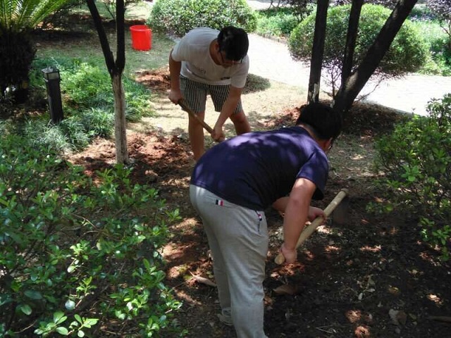 在物业中心专业人员的讲解下,委员们两人一组对草地进行除草、松土、施肥。在烈日的炙烤下,委员们浑汗如雨、互相鼓励、团结一致优质高校的完成任务,使二号公寓变得更加的整洁、美观。