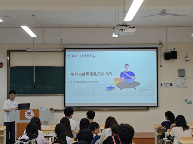 班会中,主持人以“课堂礼仪离我们有多近” 为切入点,结合桂林信息科技学院课堂礼仪规范,通过 PPT 展示将班会内容分为 课堂礼仪的重要性、课堂礼仪的具体内容、学生礼仪的其他方面及培养良好课堂礼仪的方法四个板块。在课堂礼仪重要性讨论环节,同学们结合自身经历分享感悟:有同学提到课前提前到教室、摆好学习用品,能让自己快速进入学习状态。也有同学表示课堂上不玩手机、不窃窃私语,不仅是尊重老师,更是对自己学习负责。现场交流氛围热烈,进一步强化了大家对礼仪促进师生和谐、营造良好课堂氛围的认知。