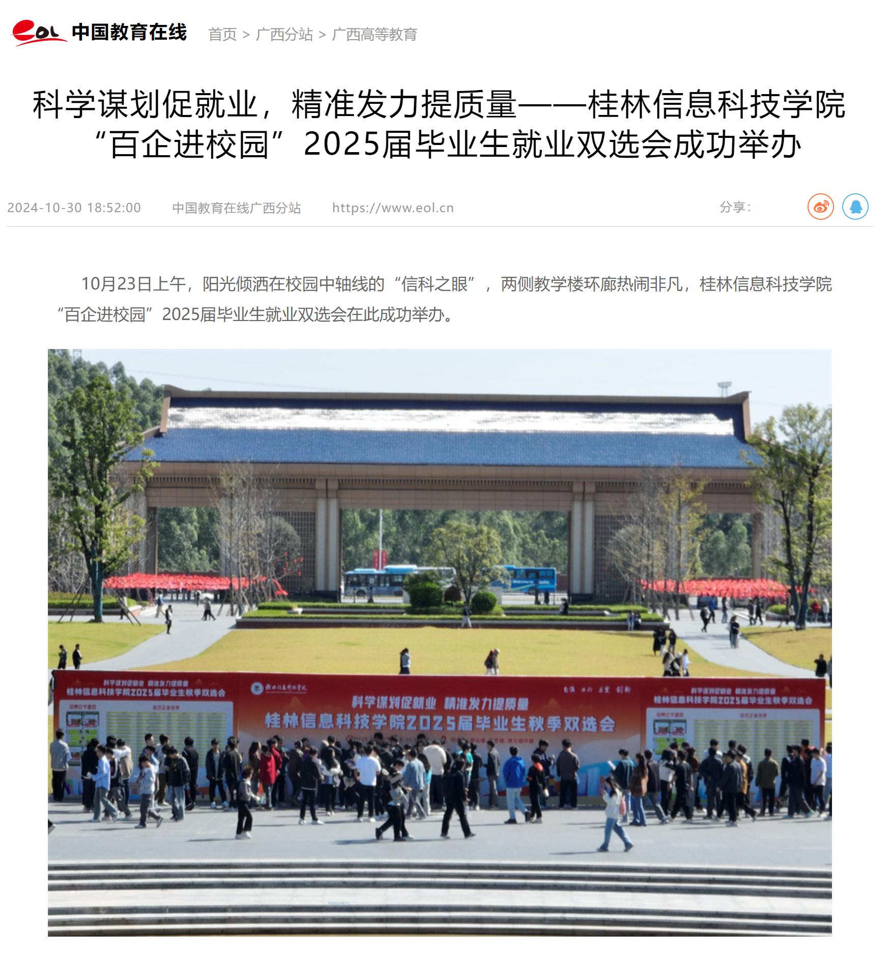 10月23日上午,阳光倾洒在校园中轴线的“信科之眼”,两侧教学楼环廊热闹非凡,桂林信息科技学院“百企进校园”2025届毕业生就业双选会在此成功举办。