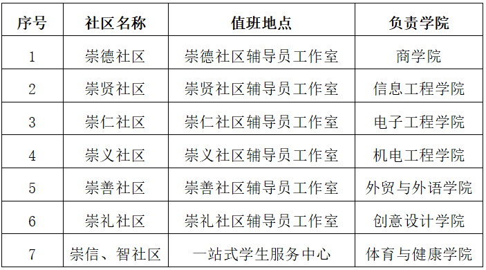 为持续推进“三全育人”综合改革,进一步落实“一站式”学生社区综合管理模式建设工作指引的要求,充分发挥辅导员在思想引导、心理服务、学业辅导、行为教导、生涯规划、就业指导等方面的教育管理和服务引导作用,推动辅导员充分践行“一线规则”,加强对学生社区的管理服务,维护校园安全稳定,预防和处置学生突发事件,实现与学生同频率、同场域、同发展。经研究,辅导员常态化下沉入住“一站式”学生社区辅导员工作室,现就相关工作安排如下: