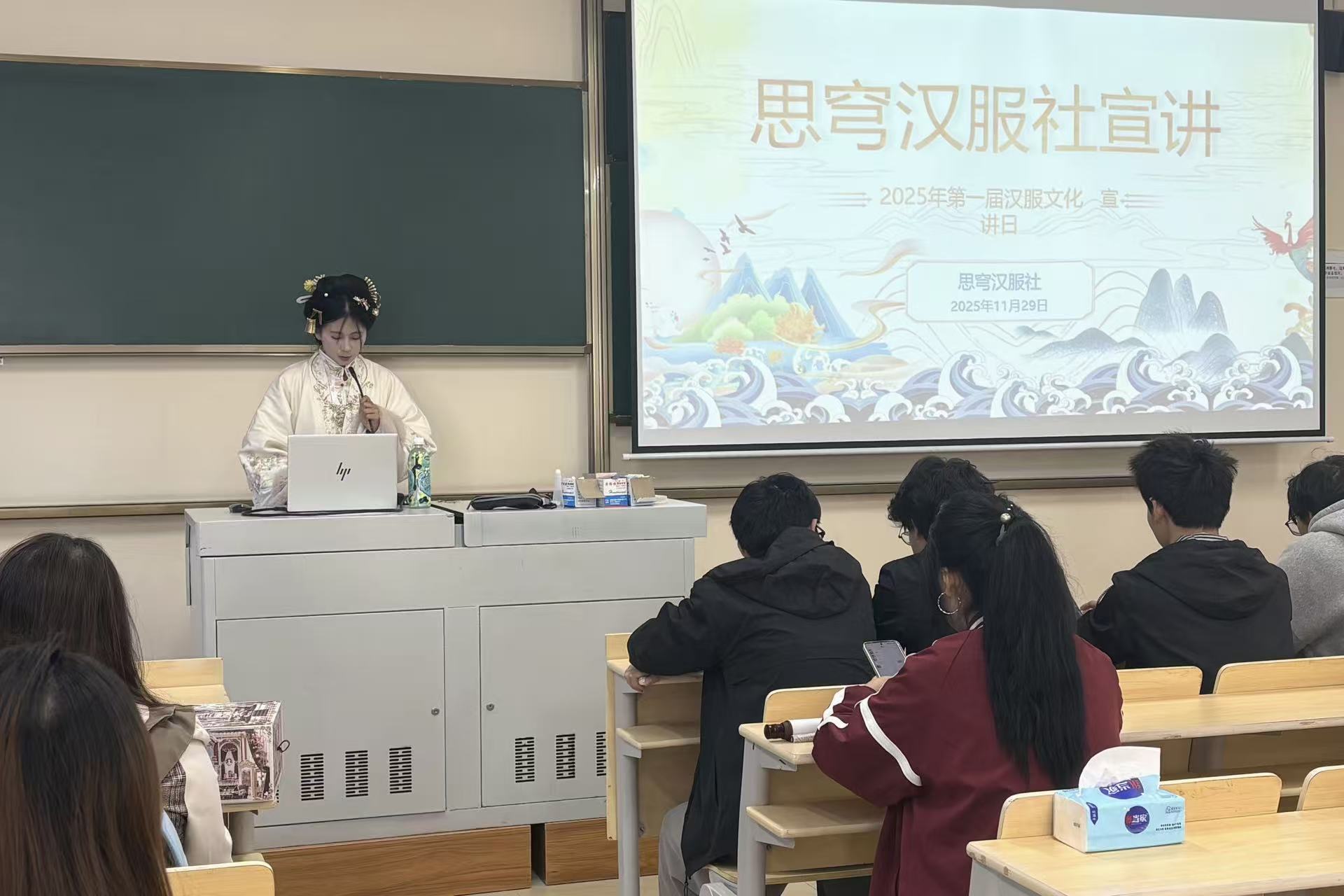 2025年11月29日,我校思穹汉服社在敏思楼D212成功举办首届汉服文化宣讲日活动。本次活动由思穹汉服社副社长杨远香主持,以“赴一场千年之约”为主题,通过深度讲解与沉浸式体验,向广大师生系统展示了汉服的独特魅力,为校园文化注入了一股典雅的古典风韵。