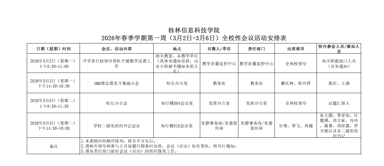 2026年春季学期第一周(3月2日-3月6日)全校性会议活动安排表