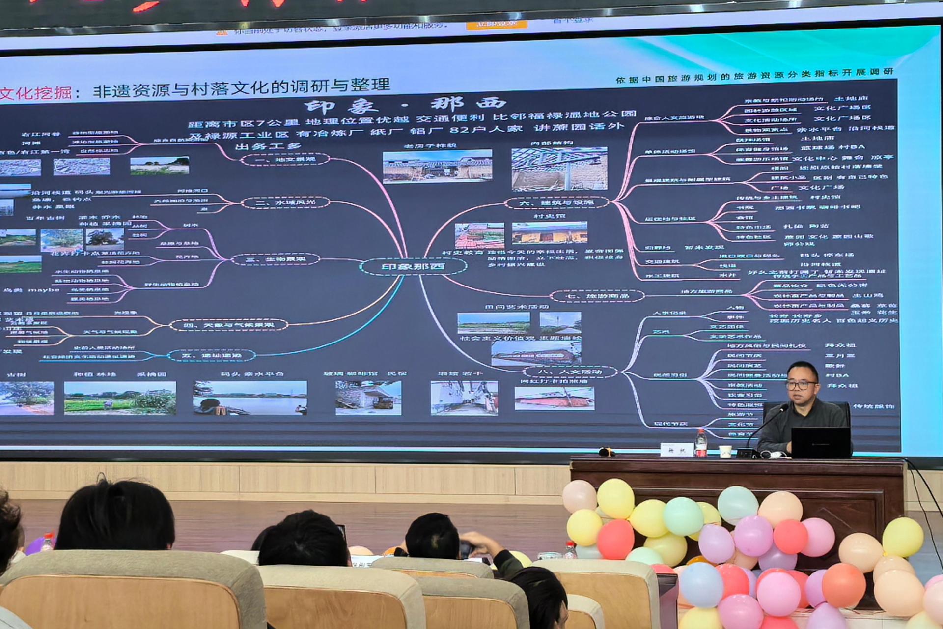 杨帆院长紧扣“艺术介入乡村振兴”这一时代课题,将“印象·那西”这一广西文化旅游发展大会的先导工程作为范本,层层剖析,为师生们进行了一场深入的解读。他首先阐述了“艺术+非遗+乡村”这一独特融合模式的理念与核心价值,奠定了理论基石;随后,他重点介绍了“印象·那西”项目从理念到落地的完整实践路径,细致拆解了如何将产、学、研、用深度融合,为艺术乡建提供了可复制的宝贵经验;通过一系列鲜活生动的案例呈现,他将文化创意、艺术创作如何激活乡村文化、促进农文旅产业融合的过程变得可视、可感;最后,他还展望了艺术介入乡村振兴的广阔前景与深刻内涵,激发了师生们对未来的无限思考。