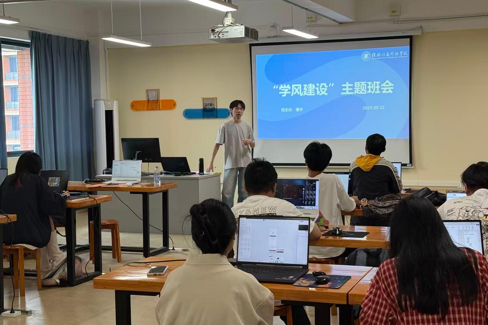 2025年9月29日,2023级虚拟现实技术专升本1班在G310教室隆重召开学风建设主题班会。班主任唐宇老师主持会议,围绕学校合格评估动员、课堂纪律规范、学生形象提升以及国庆假期安全等四个方面进行了系统讲解。