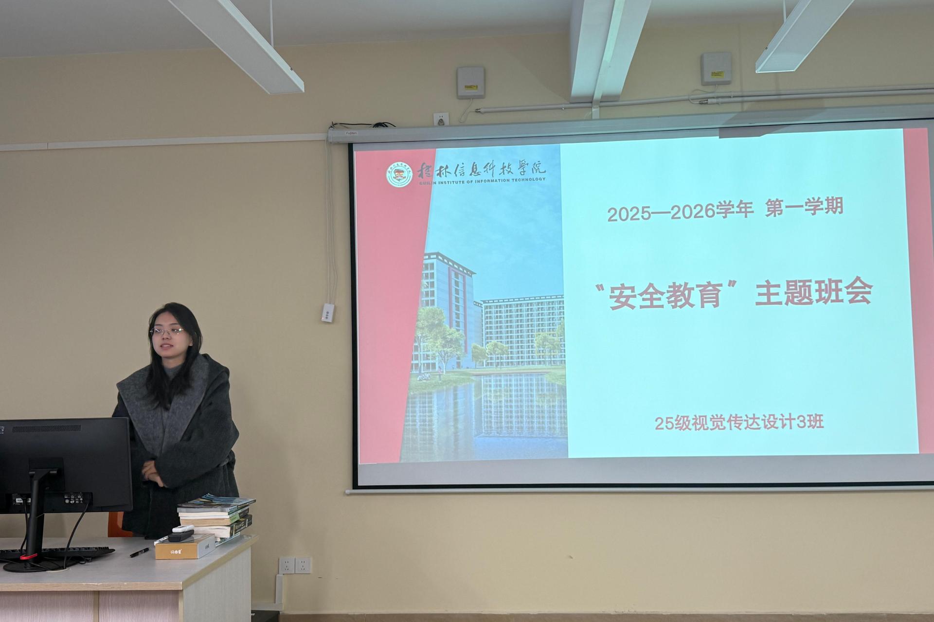 为筑牢安全防线,保障学生校园生活安全,11月18日,杨昕雨老师于守正楼G410教室开展安全教育主题班会,2025级视觉传达设计3班全体同学参会。