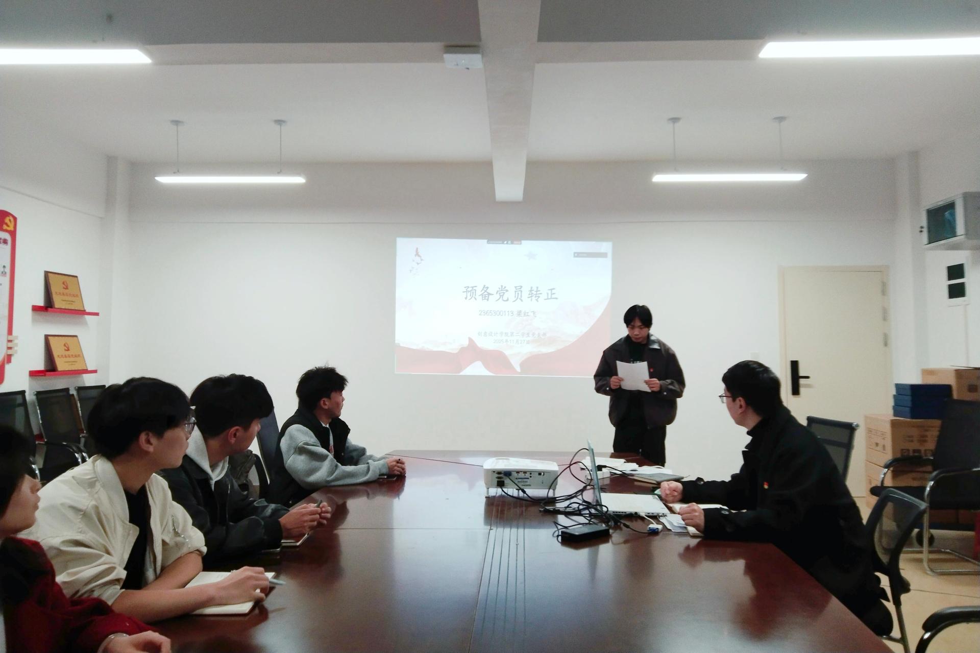11月25日,创意设计学院第二学生党支部在守正楼G517教室召开支部大会,讨论梁红飞同志预备党员转正问题。会议由刘思同志主持,全体党员参会。