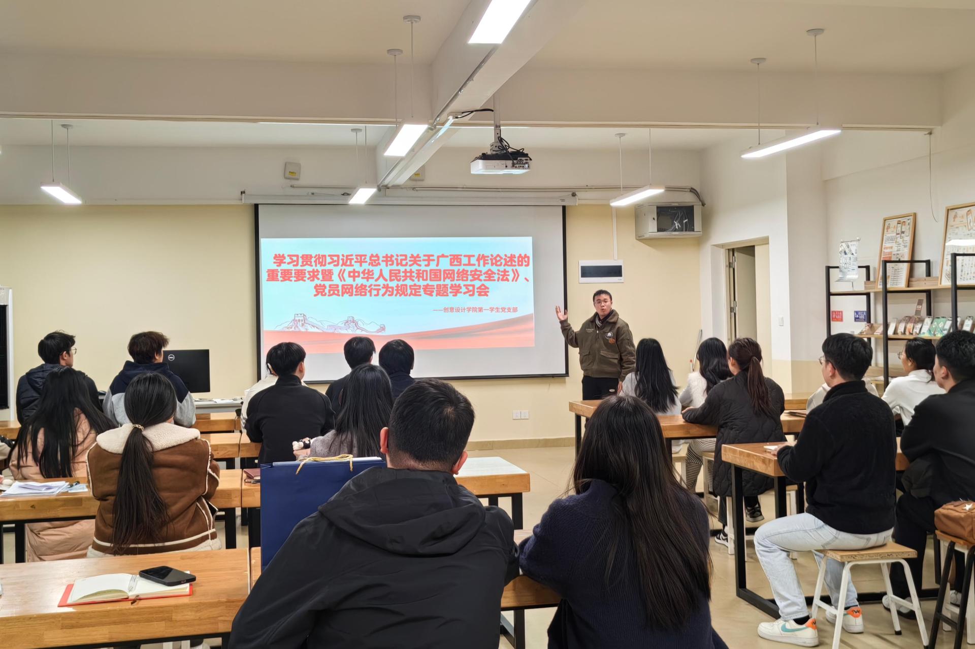 为深入学习贯彻习近平总书记关于广西工作的重要论述要求,巩固学习成果、提升党员网络安全意识与责任担当,近日,创意设计学院第一学生党支部在G411举办专题学习会,聚焦习近平总书记对广西工作的重要论述要求以及《中华人民共和国网络安全法》和党员网络行为规定。会议由支部书记周金悦主持,党支部全体党员参与。
