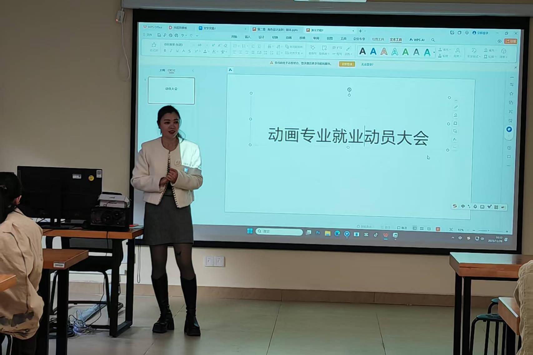 12月22日,动画专业于在守正楼G409教室成功举办2026届毕业生就业动员大会。本次大会由动画教研室主任伍菲老师主持,旨在帮助毕业生明确就业方向、增强就业意识,为即将到来的求职季做好充分准备。会上,伍菲老师围绕当前动画行业发展趋势和人才需求特点,系统分析了毕业生面临的机遇与挑战。她指出,同学们在扎实掌握专业基础的同时,应主动适应行业对创意能力、项目实践和团队协作的新要求,积极把握招聘平台和行业赛事等多渠...