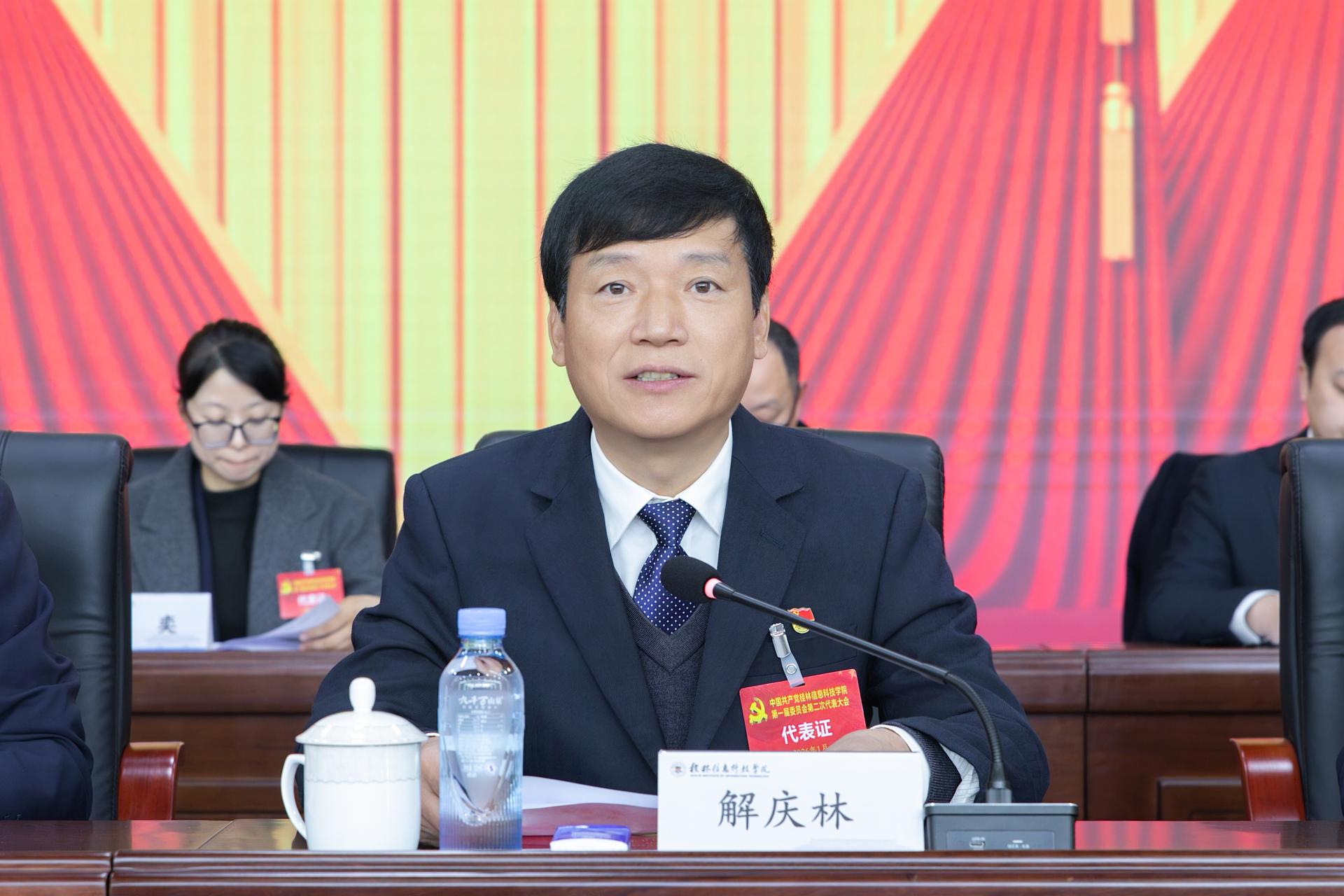 解庆林同志宣读《中共桂林市委员会教育工作委员会关于对中共桂林信息科技学院委员会选举事项的批复》