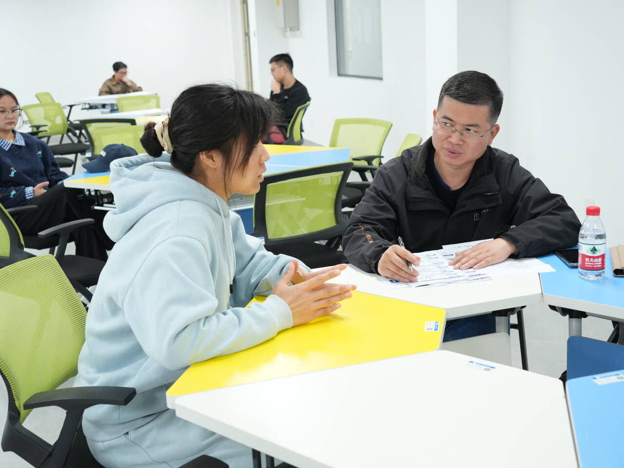 当天下午,专场面试在产教融合中心XZ202、XZ207、XZ310教室同步开展。学子们携带简历有序候场,积极与面试官交流互动,充分展现自身专业素养与综合能力,企业代表对我校学生的精神风貌和专业功底给予充分肯定。此次活动不仅为学子提供了优质实习就业岗位,更深化了学校与吉利集团的合作情谊,为后续校企协同育人奠定了坚实基础。