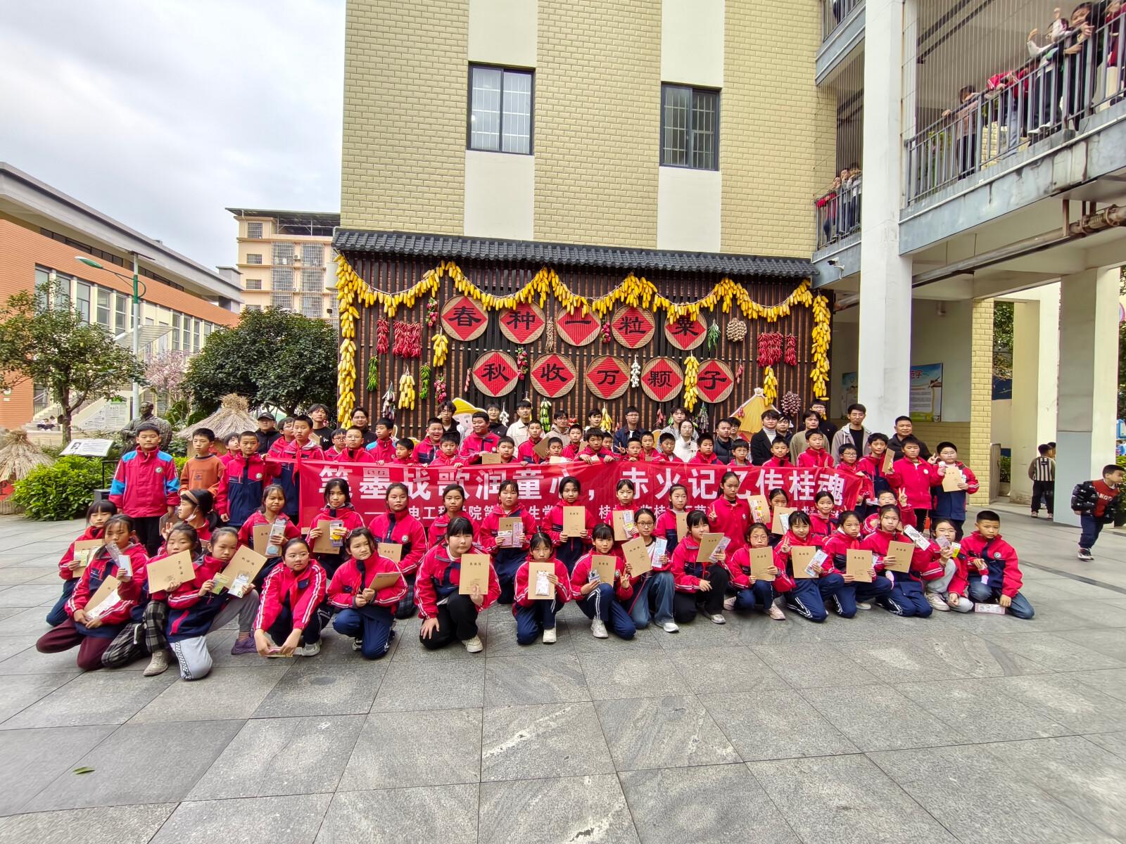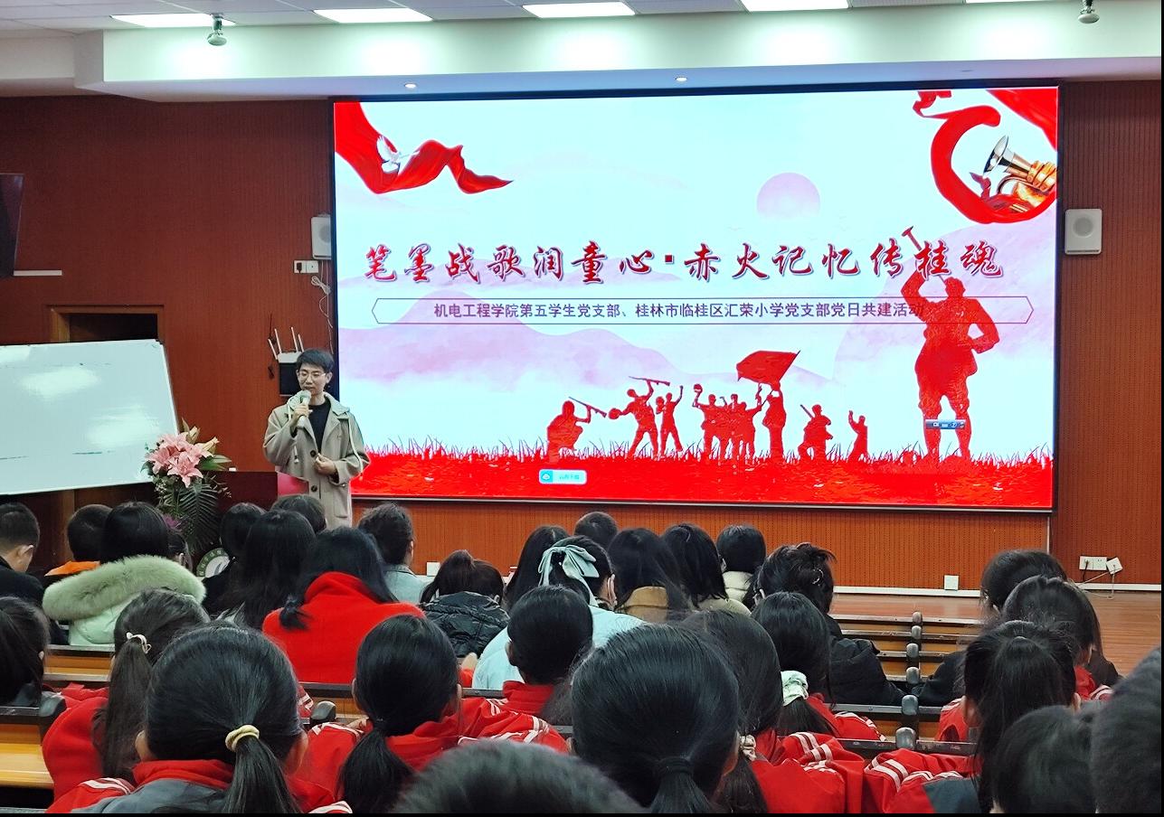 为深化校地党建共建,厚植青少年爱国主义情怀,挖掘桂林本土抗战文化资源,12月16日,机电工程学院第五学生党支部携手桂林市临桂区汇荣小学党支部,开展以“笔墨战歌润童心,赤火记忆传桂魂”为主题的党日共建活动,将桂林抗战文化城的红色故事带进五年级的课堂,为两校党支部搭建起红色教育联动的坚实桥梁。