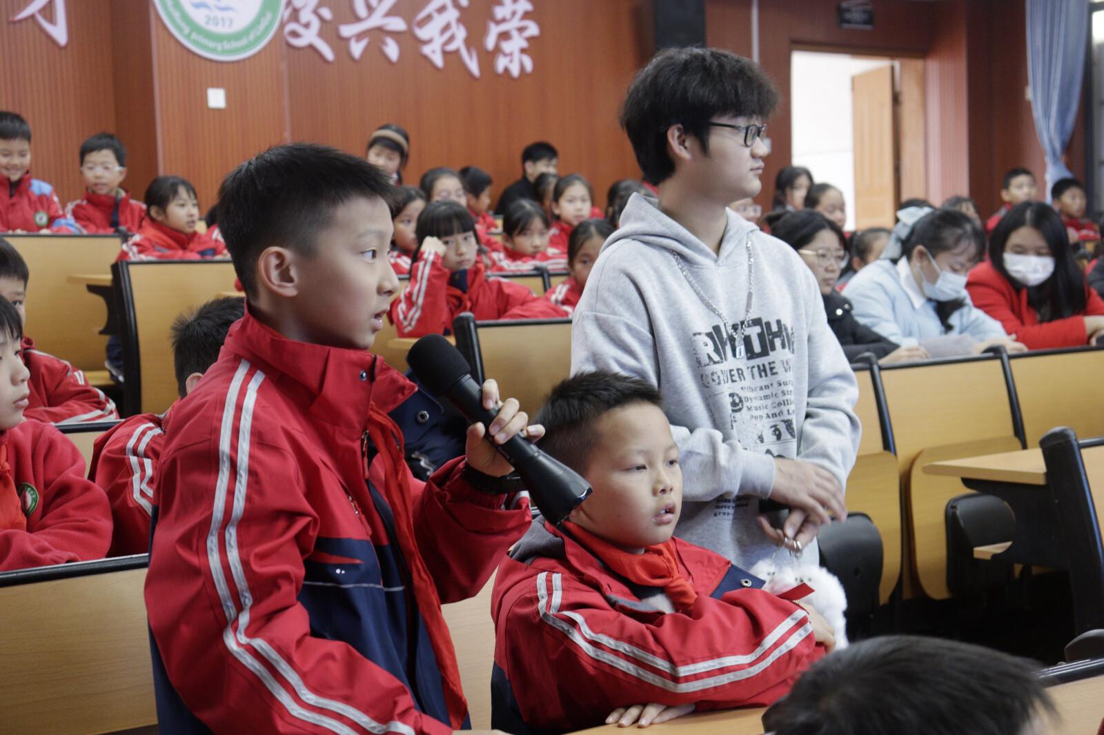 致辞结束后,红色主题宣讲环节正式拉开帷幕。党支部党员代表依次带来《山水间的“文化战斗”》与《山洞里的教室——岩洞教育故事》,围绕桂林抗战文化城的历史背景,结合前期读书会与研学活动中积累的鲜活故事、珍贵史料,带领同学们重温80余年前桂林这片热土上,文化先辈们以笔为枪、以文抗战的峥嵘岁月,让爱国情怀在孩子们心中悄然扎根。宣讲现场互动频频,掌声阵阵。