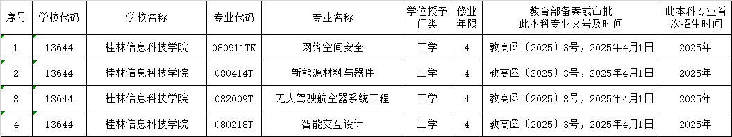 根据国务院学位委员会《学士学位授权与授予管理办法》(学位〔2019〕20号)和自治区学位委员会、自治区教育厅《广西壮族自治区学士学位授权与授予管理办法》(桂教规范〔2022〕7号)以及《广西壮族自治区学士学位授权审核标准》要求,经各二级学院组织专家论证及申报,教务处审核,学校学位评定委员会审议,同意新增网络空间安全(080911TK)、新能源材料与器件(080414T)、无人驾驶航空器系统工程(082009T)、智能交互设计(080218T)4个专业为学士学位授权专业。