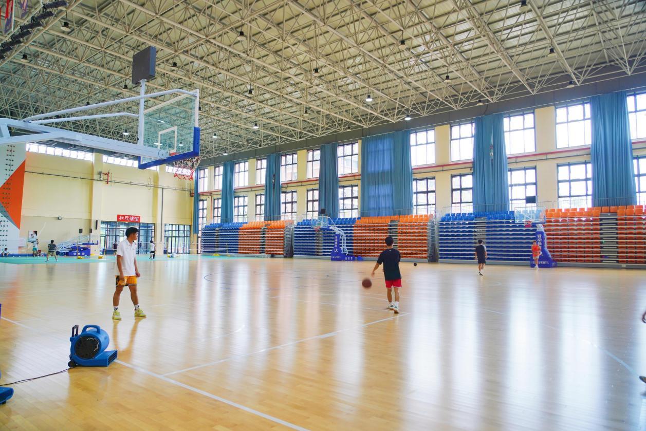 室内体育馆总面积约7630㎡,设有2个室内篮球场、6个羽毛球场、乒乓球室以及攀岩墙,乒乓球室配备有空调。球场边上有可展开的观众席,能够满足举办比赛和观众观赛的需求。