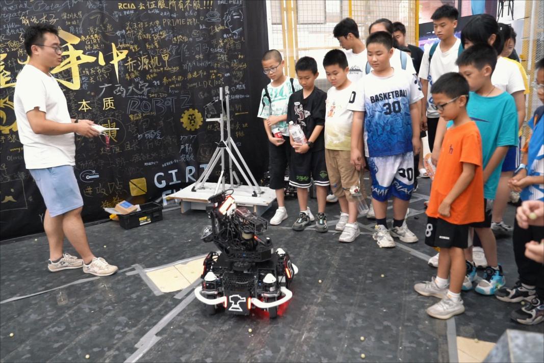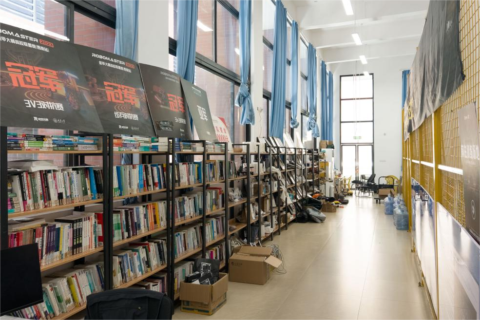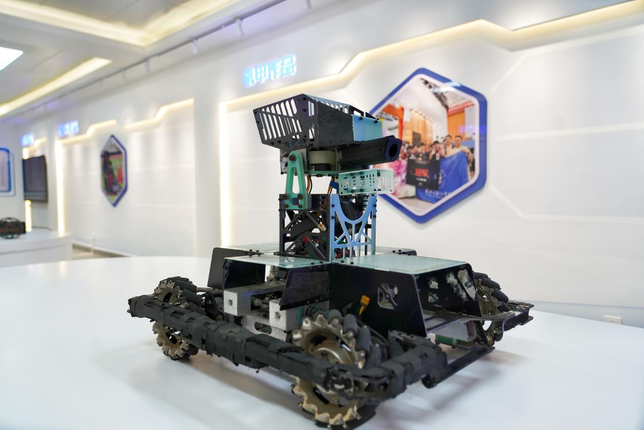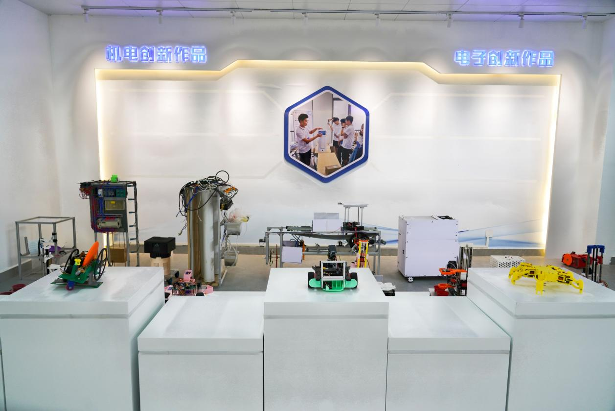 创新实践中心设有近500平方米的综合厅,集文化长廊、路演厅(约180㎡,可容纳90余人)、成果展示厅(含机甲、智能车、无人机、数字、机电、电子及大创七大展区)为一体。