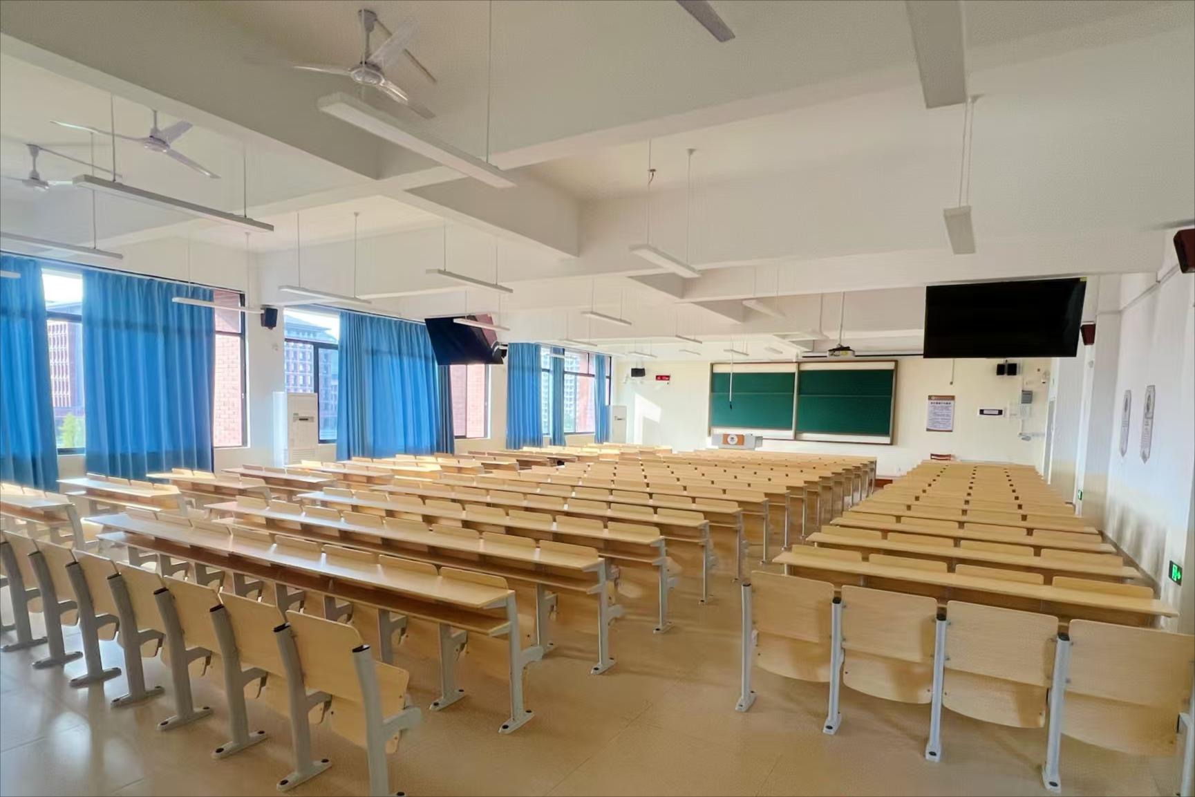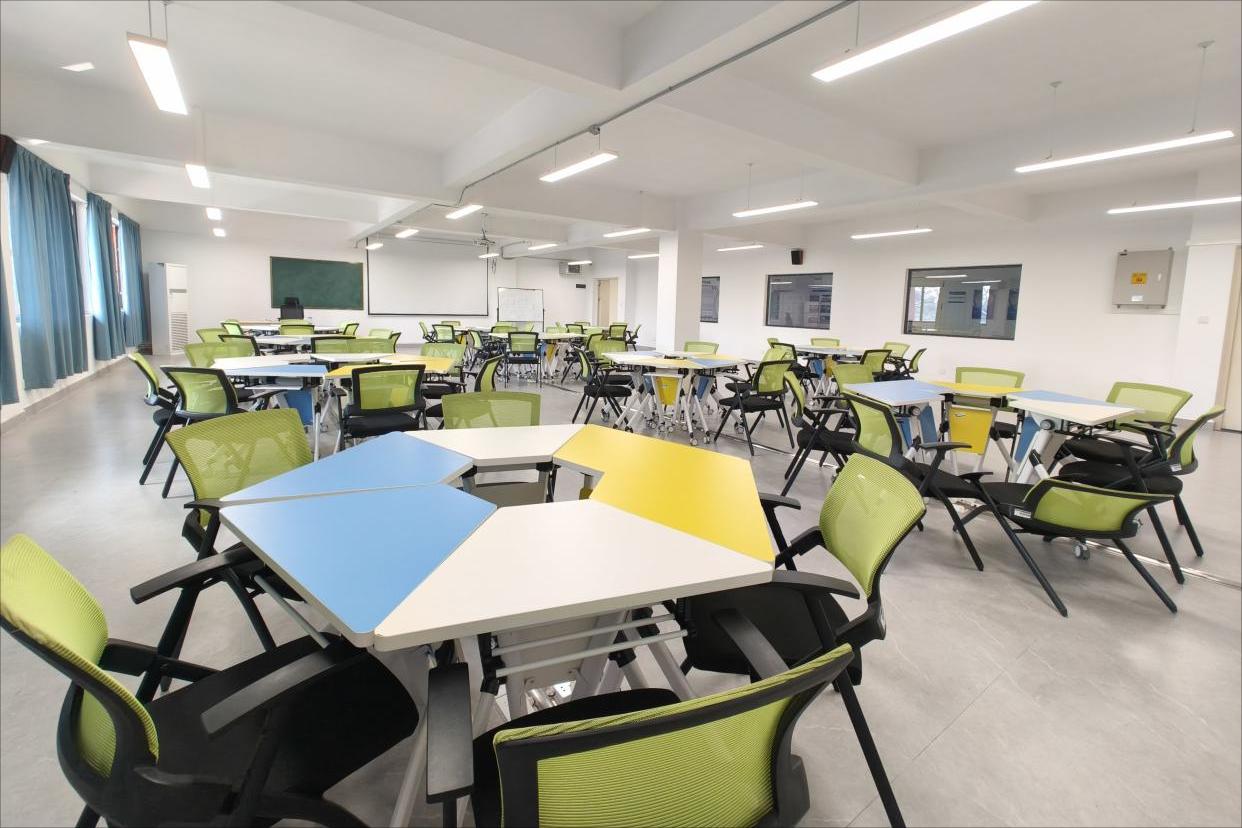 多功能教室包含投影仪/电子白板、音响、中控系统,满足课件演示与互动教学。