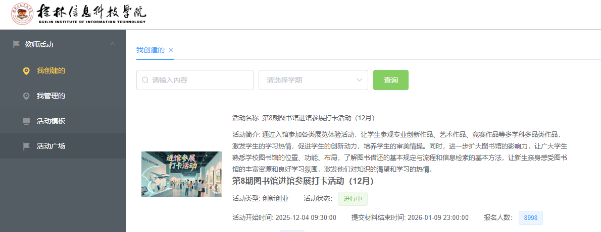 2.活动影响力继续扩大。截止12月31日,图书馆共开展“文明监督岗”活动50期,参与活动337人次;“义务劳动”活动51期,参与活动447人次;“阅读‘悦’见美好”图书借阅活动10期,活动参与人数超12100人次;举办“阅动前行”线下读书会3期、进馆参展打卡与借书活动8期,参与活动超9000人次,举办职业规划和信息素养讲座2期,参与活动超300人次,举办“云悦读”等数字素养活动8期,参与活动超200人次。全年共举办各类素质素养活动123期,参与活动超22300人次。丰富多彩的活动,为广大学生提供了实践平台。