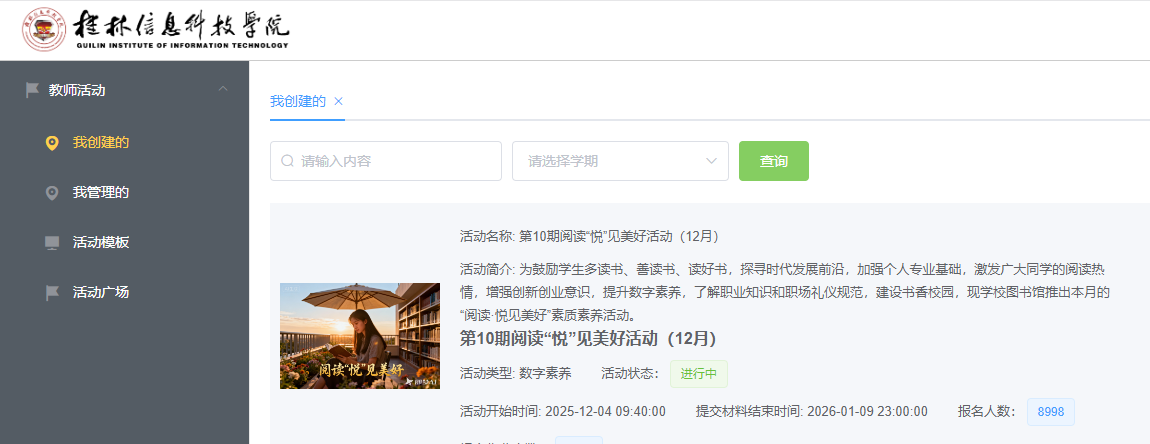 1.丰富了素质素养活动类型。2025年,根据图书馆场所特点和活动需要,图书馆在素质素养服务平台面向24级、25级学生,在2024年秋季开展美育“文明监督岗”、劳育“义务劳动”、“阅读‘悦’见美好”“阅动前行”线下读书会、进馆参展打卡和讲座等6大类活动的基础上,还新增了经典“云悦读”数字素养、4.23共读半小时活动,进一步丰富了活动该内容,培育了读者的文明素养,培养了学生吃苦耐劳、珍惜成果的劳动精神,同时激发读者的阅读热情,进一步营造了浓厚的爱读书、读好书、善读书的氛围。