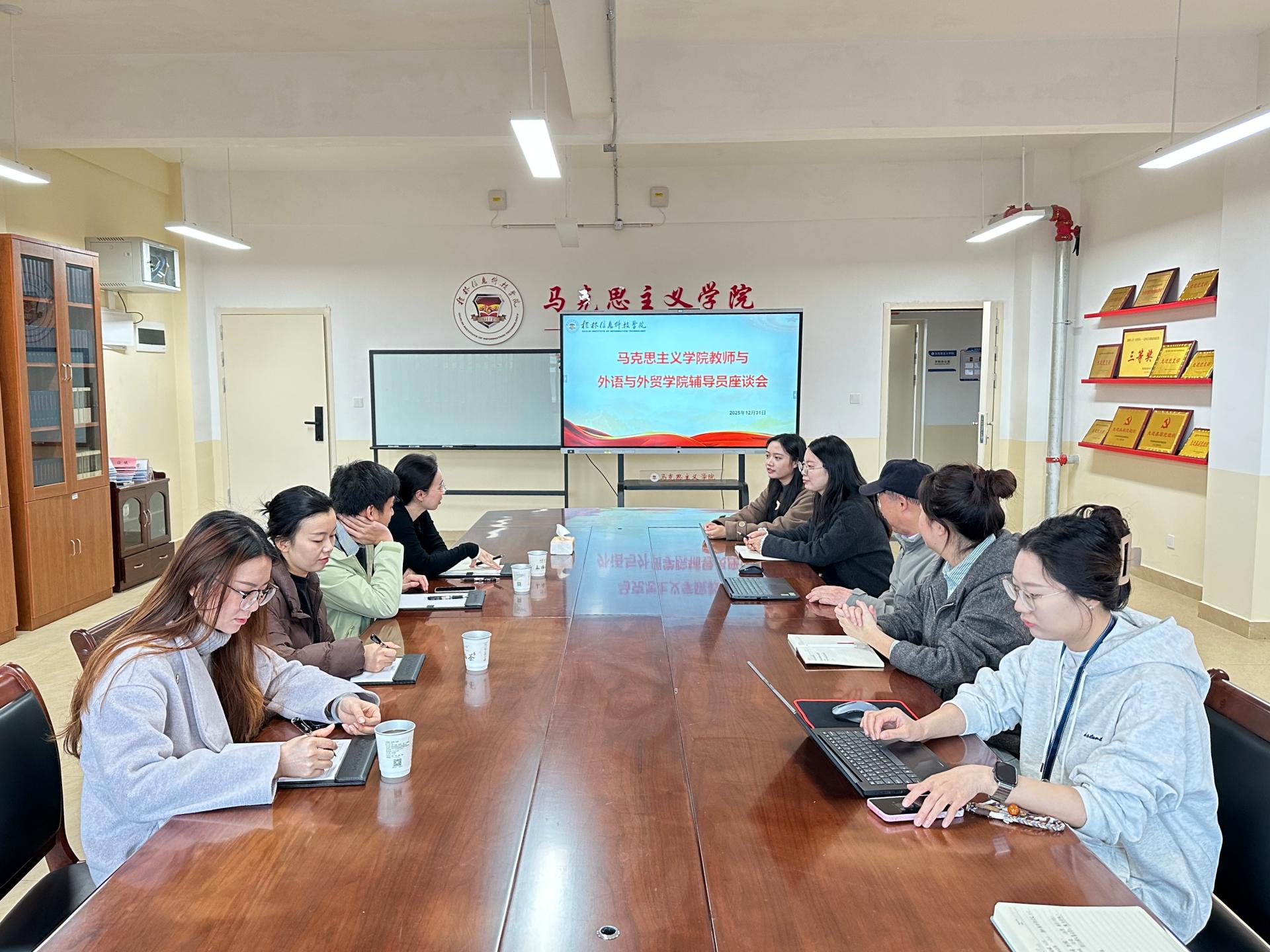 研讨会上,马克思主义学院教师首先系统分析了外语与外贸学院学生的学习情况。外语与外贸学院辅导员则重点反馈了学生对思政课程的具体建议。经过充分讨论,双方达成共识:将通过建立常态化学情反馈机制、优化课程内容体系、深化实践教学协同等举措,切实提升思政育人实效。