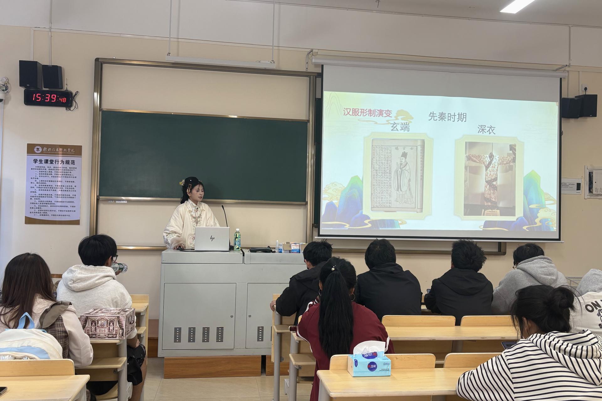 思穹汉服社社长彭丽萍表示,我们举办这次活动,是希望打破大家对汉服的刻板印象。汉服不仅仅是一件漂亮的衣服,它更是承载着我们民族历史、哲学与礼仪的文化符号。我们希望通过这样的宣讲,让更多同窗了解它、热爱它,并从中建立文化自信。