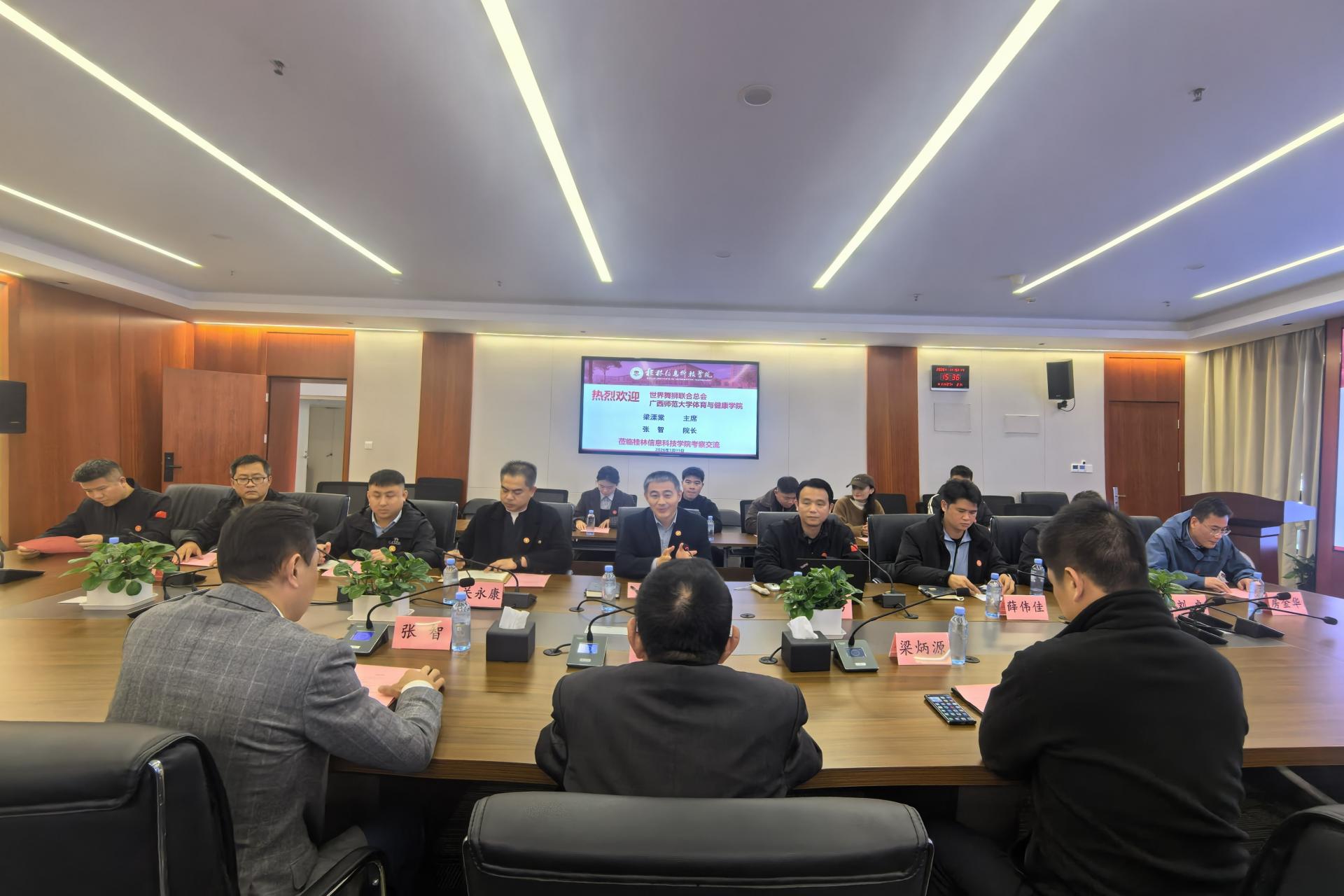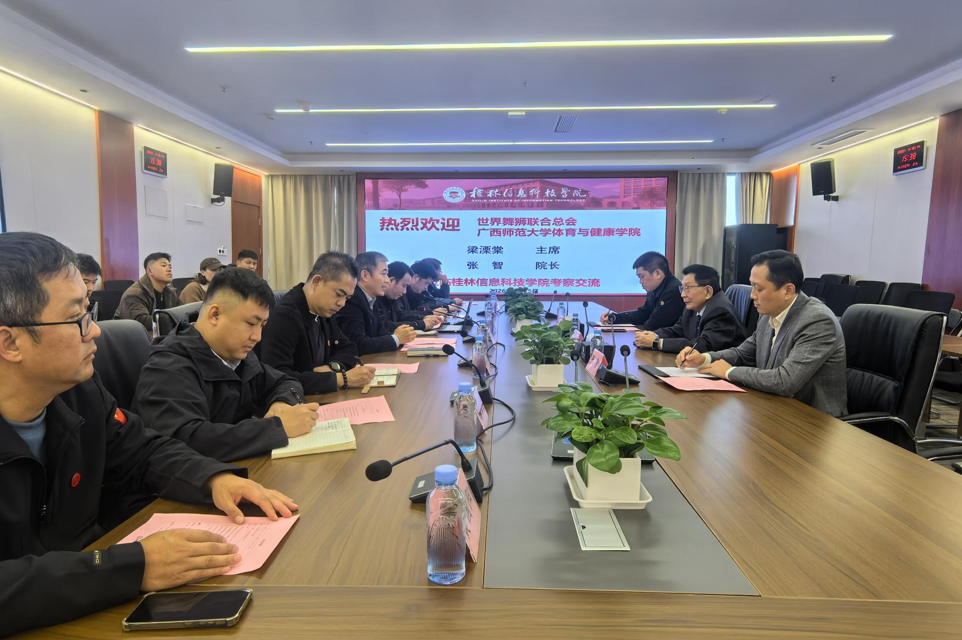2026年1月15日下午,世界舞狮联合总会主席、马来西亚龙狮运动联合会主席梁溧棠,世界舞狮联合总会副主席、广西师范大学体育与健康学院副院长张智一行来我校考察交流。此次活动旨在深化校会合作,共推龙狮文化传承与发展。我校党委副书记李飞、体育与健康学院领导班子、各教研室主任以及教师代表在知行楼810会议室接待了考察团一行。座谈会由李飞主持,双方围绕龙狮文化人才培养、赛事合作、文化传播等议题开展深度座谈。