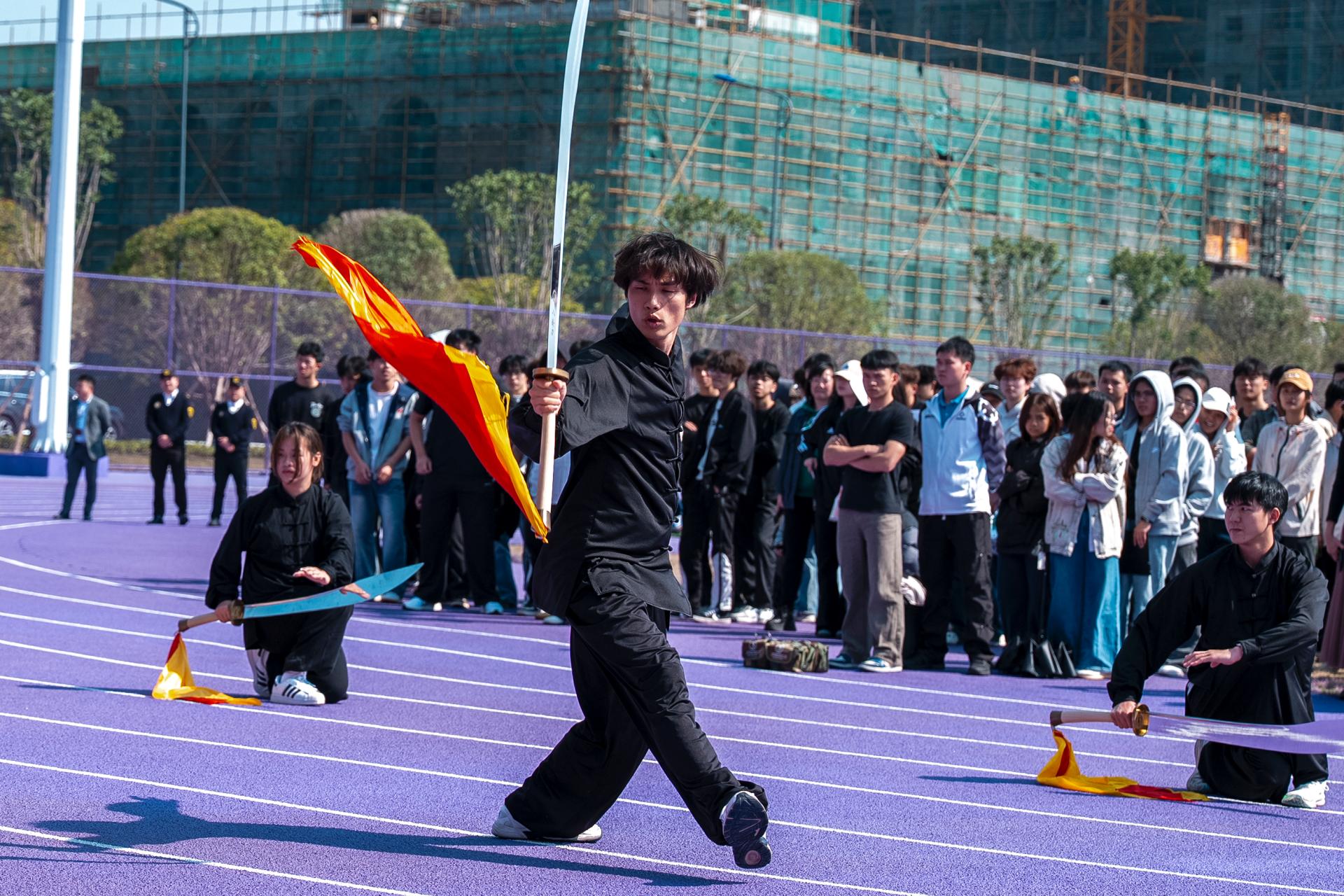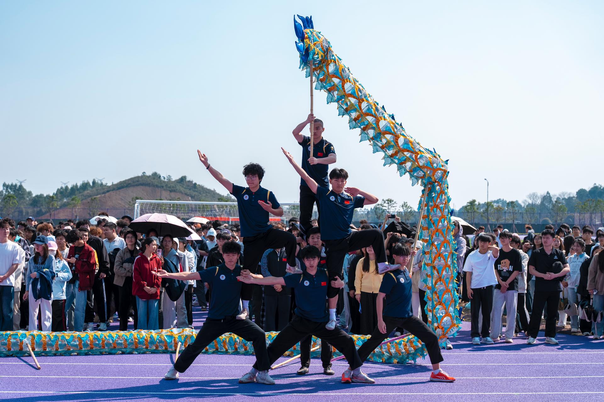 仪式暖场环节,体育与健康学院师生带来舞龙、舞狮和八卦大刀表演。启用仪式中,甘勇书记宣布:桂林信息科技学院二期校区体育场正式启用!并向参与体育场建设、筹备工作的全体人员致以诚挚谢意。同时勉励全体师生以体育场启用为契机,积极参与体育锻炼,发扬体育精神,在运动中强健体魄、砥砺品格,以饱满的精神状态投入到学习、工作与生活中。随后,党委副书记李飞为本次启用仪式的足球友谊赛进行开球。