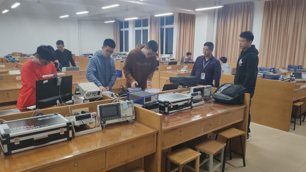 10月9日晚,电子工程系副主任韩桂明、系分团委书记范恒祯前往比赛用实验室进行设备故障检查,排除安全隐患,以保证本次电子大赛顺利进行。