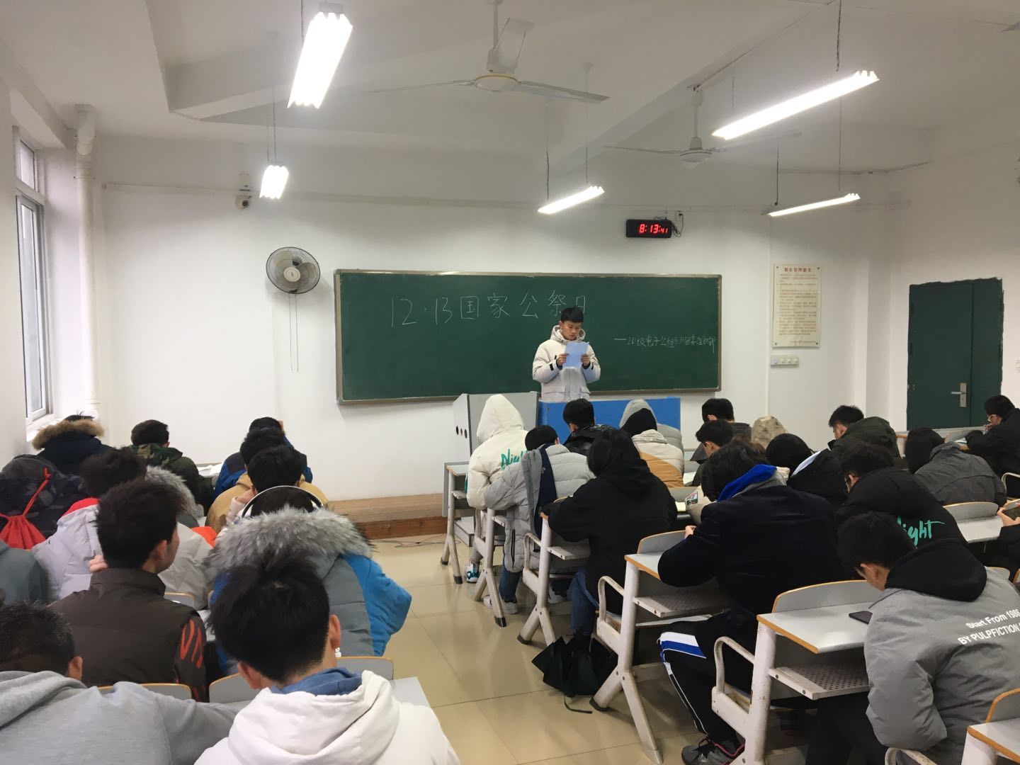 为提高团员政治素质,坚定政治方向,12月15日,电子工程系组织开展“国家公祭日”主题团课,此次团课覆盖所有团支部,由各班团支书主持。