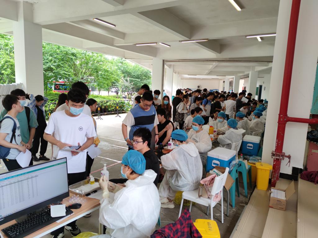 接种新冠疫苗,共筑免疫长城。电子工程系按照学院接种工作方案,由系党总支书记庄璧瑛带队,系分工会主席和各年级辅导员组织师生于5月24日、25日两天分别前往我院临时接种点三教一区空地,按照接种程序集体进行了新冠肺炎疫苗第一针的接种。