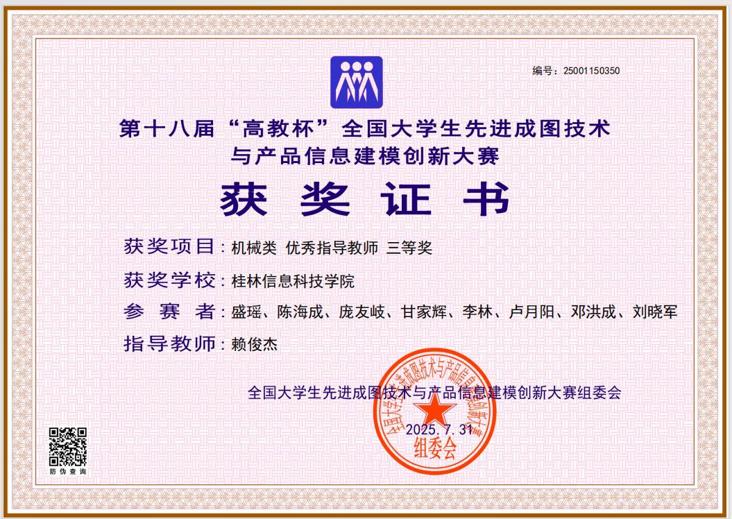 在本届大赛中,我校机电工程学院牵头组织参赛工作,院长助理莫荣担任领队,机械设计制造及其自动化教研室主任、银龄教师王丽娟教授统筹规划,为选手提供全流程专业指导与资源保障。参赛团队展现出深厚的工程图学功底、精湛的建模技艺及突出的创新思维,最终荣获机械类团体全国三等奖1项,先进成图技术赛道、数字化创新设计赛道全国三等奖各1项;莫荣、王丽娟等5名指导教师因教学成效显著,获评“优秀指导老师”。