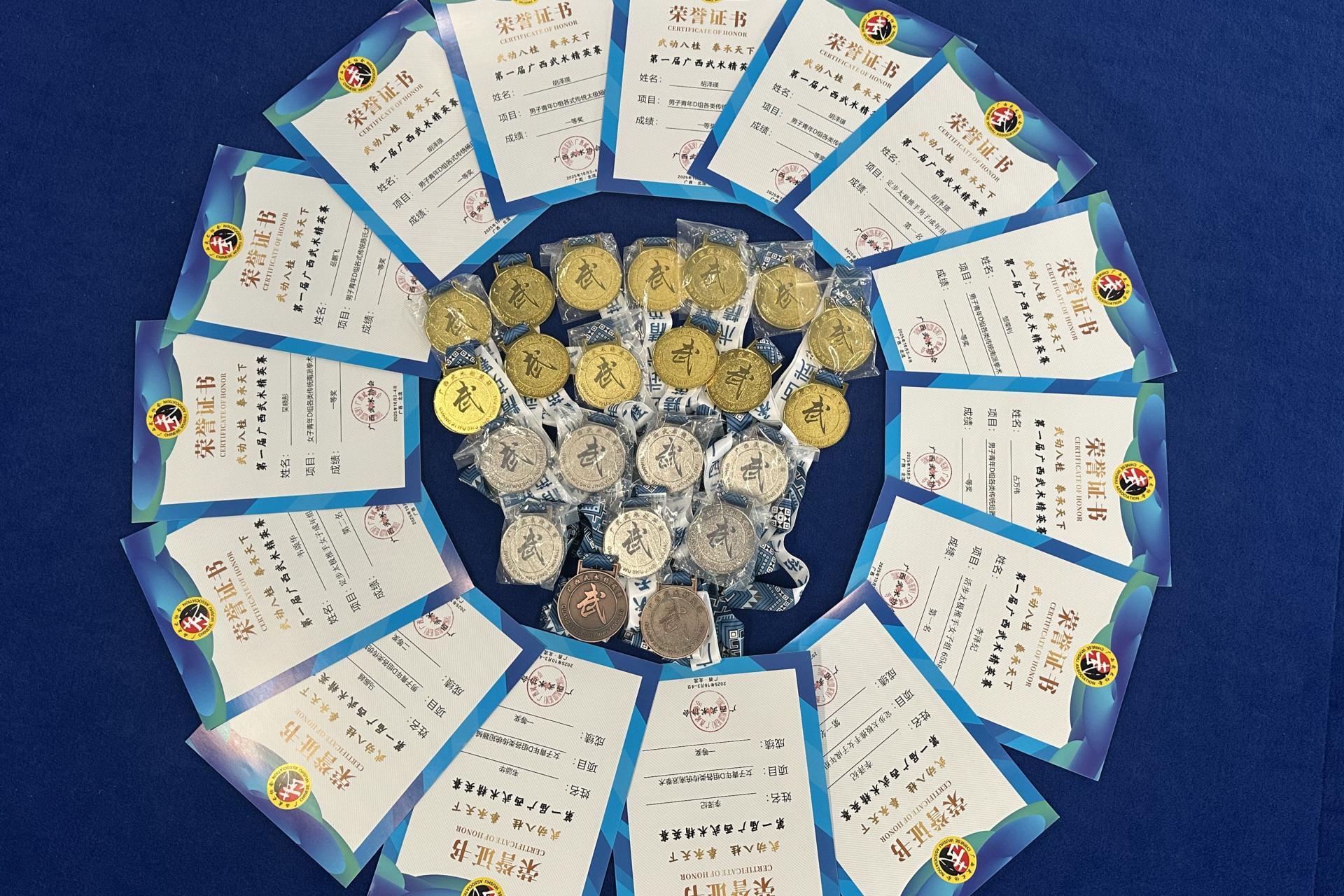 近日,2025“武动八桂·拳承天下”第一届广西武术精英赛在广西北流市顺利举行,我校代表队受邀参赛,体育与健康学院黄富强老师带队,共斩获13金的佳绩。同时,在本次比赛中,我校荣获体育道德风尚奖。