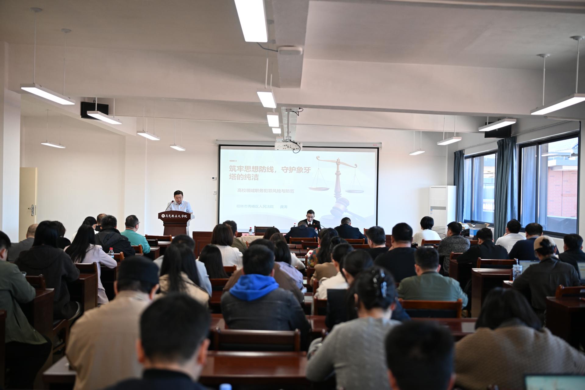 本次讲座特别邀请了桂林市秀峰区人民法院法官龚涛担任主讲人。龚法官结合多年刑事审判经验,深入剖析了高校领域职务犯罪的风险点及防范措施。他指出,高校并非职务犯罪的“避风港”,教师及管理人员同样面临职务犯罪的风险,必须纠正“职务犯罪与高校教师无关”的错误认知。讲座中,龚法官还详细介绍了贪污罪、受贿罪、挪用公款罪等与高校关联密切的职务犯罪罪名,并通过一个个实际案例,警示与会人员职务犯罪的严重后果。他强调,高校人员应增强法律意识,敬畏权力,慎独慎微,按章办事,净化社交圈子,平衡心态,珍惜体面职业和幸福生活。
