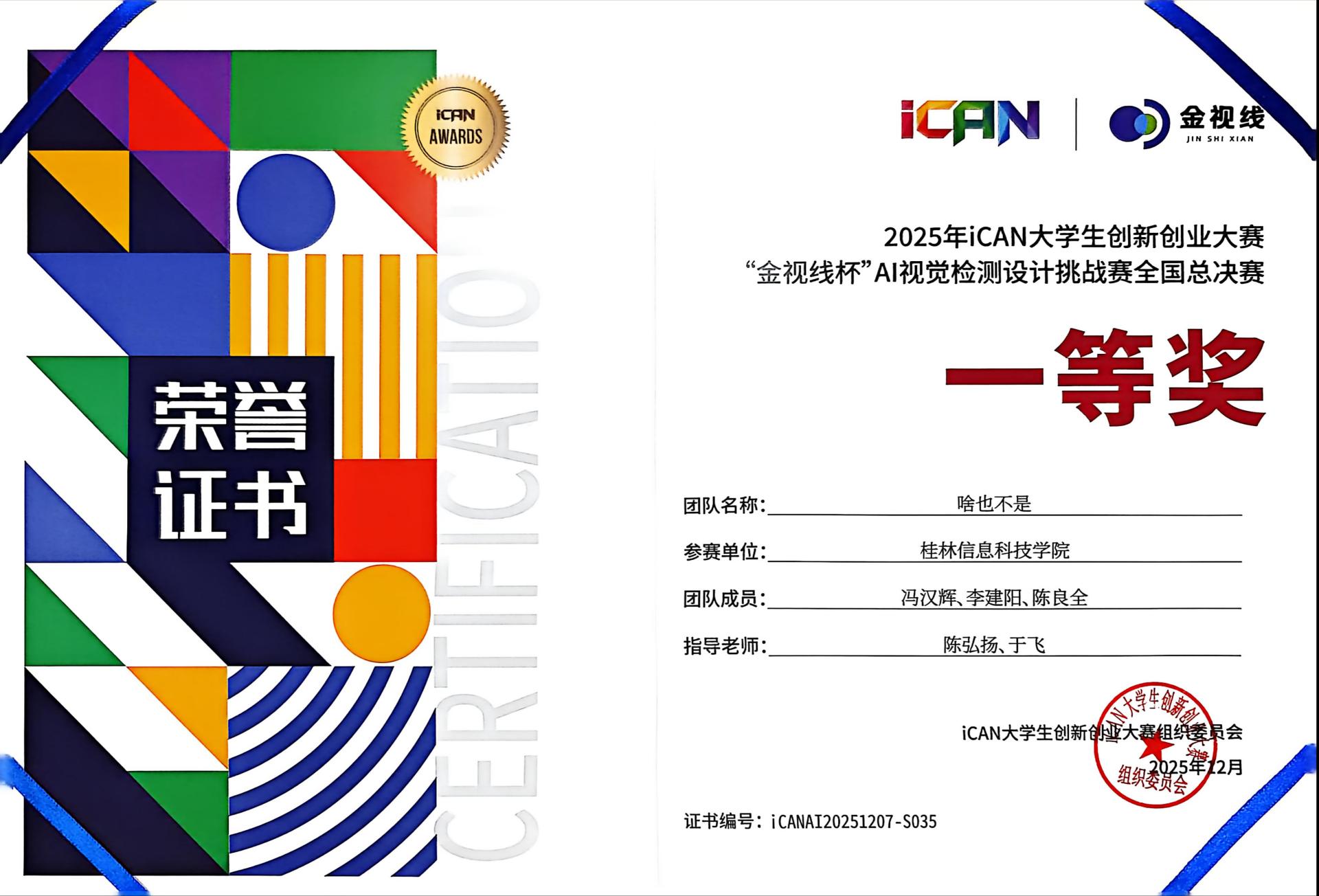 近日,2025年ICAN大学生创新创业大赛“金视线杯”AI视觉检测设计挑战赛全国总决赛在江苏大学落下帷幕。经过区域选拔、全国初赛与决赛的层层比拼,我校参赛团队凭借扎实的技术功底与出色的现场发挥,最终荣获全国一等奖(团队成员:冯汉辉、李建阳、陈良全,指导老师:陈弘扬、于飞),实现了学校在该项高水平人工智能竞赛中的历史性跨越。