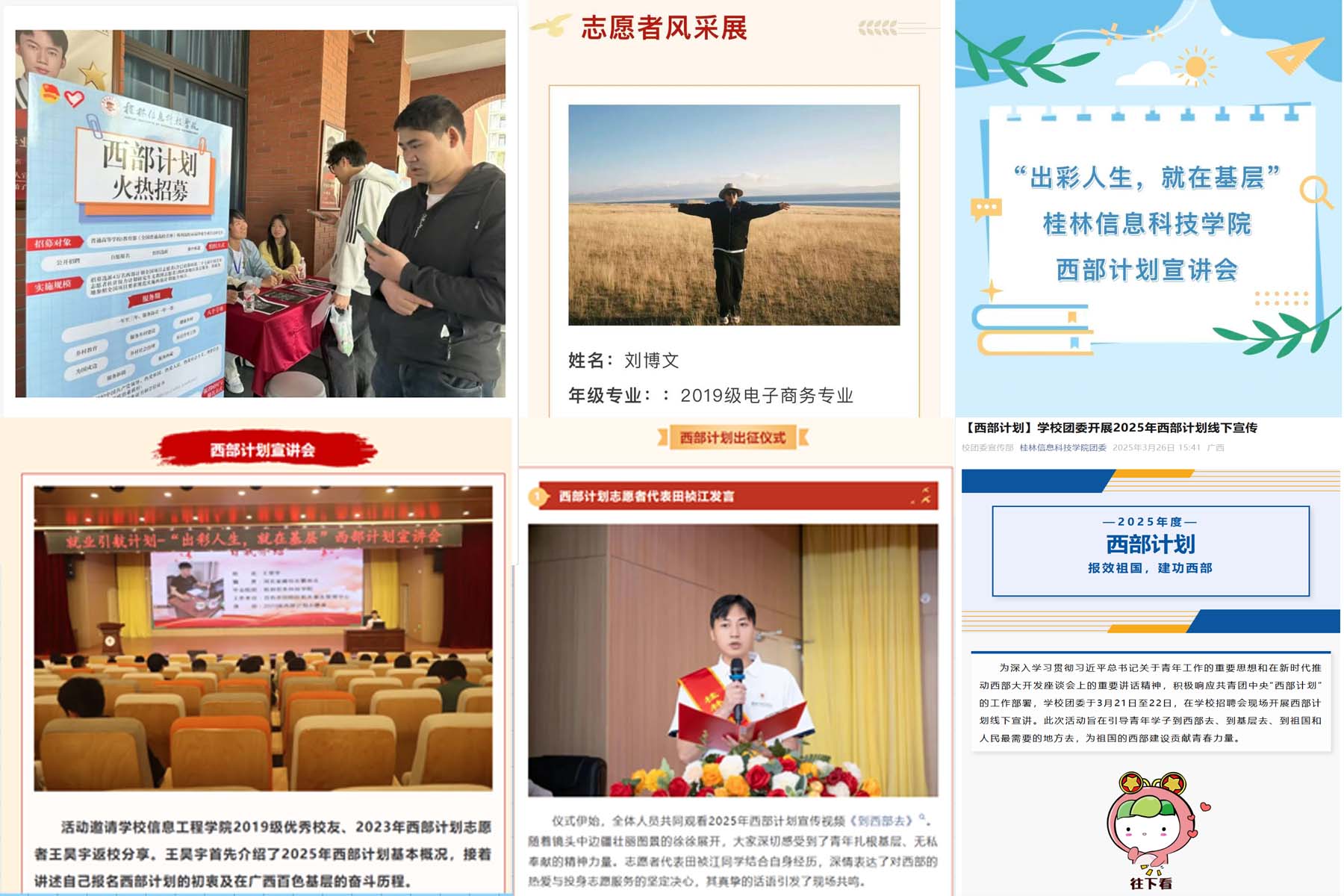 基层故事,照亮前行之路。为让同学们直观深刻认识西部计划,激发投身热情,学校举办“出彩人生,就在基层”西部计划宣讲会,特邀2023年志愿者王昊宇返校分享,他分享了他在西部基层的工作经历与成长感悟。各学院团委积极响应,广泛开展政策宣讲,有重点、分层次动员,深入班级、宿舍与学生交流,助其全面了解政策。学校和学院的努力,让越来越多同学坚定了去西部的决心。