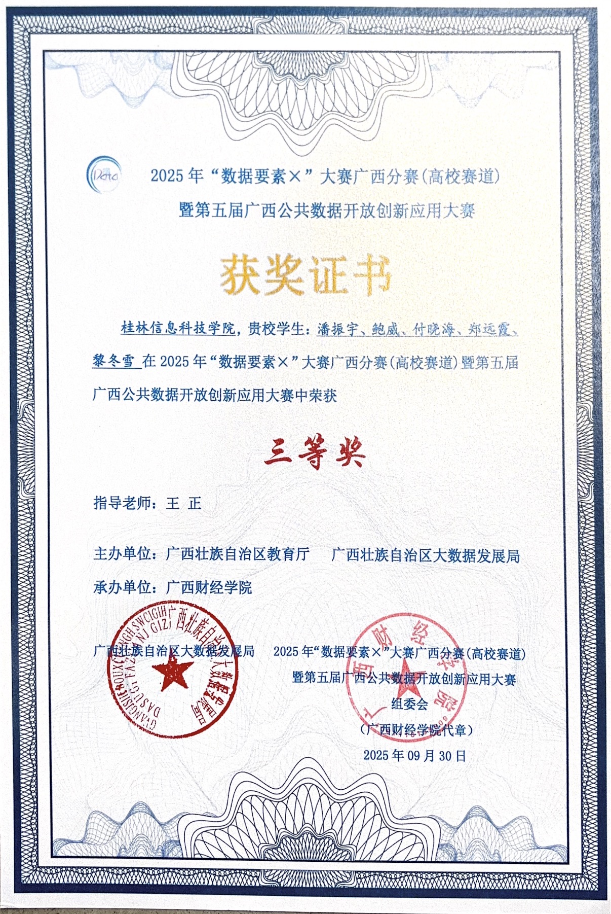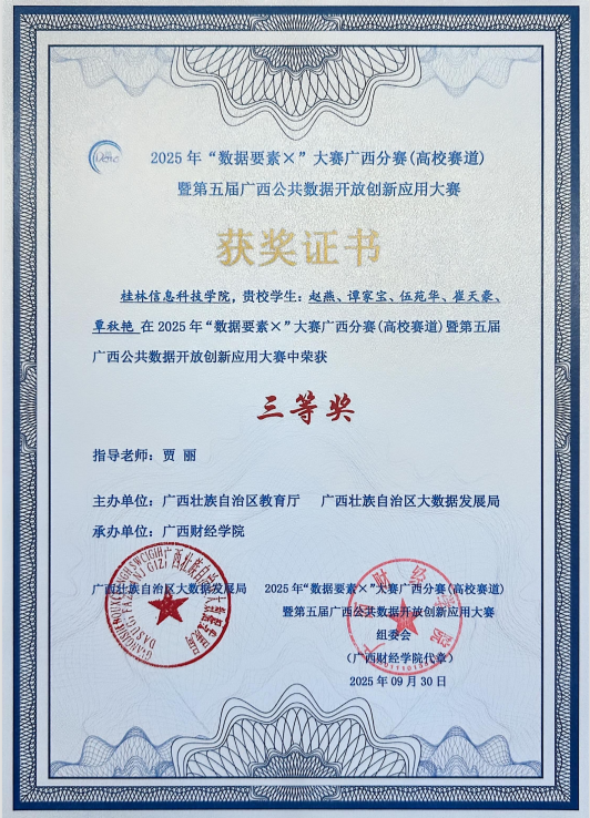 近日,“数据要素X”大赛广西分赛(高校赛道)暨第五届广西公共数据开放创新应用大赛于广西财经学院举行。在这场汇聚了众多高校精英的激烈角逐中,我校信息工程学院学子凭借卓越的实力与不懈的努力,脱颖而出,斩获区级二等奖一项、三等奖两项的优异成绩,为学校赢得了荣誉。