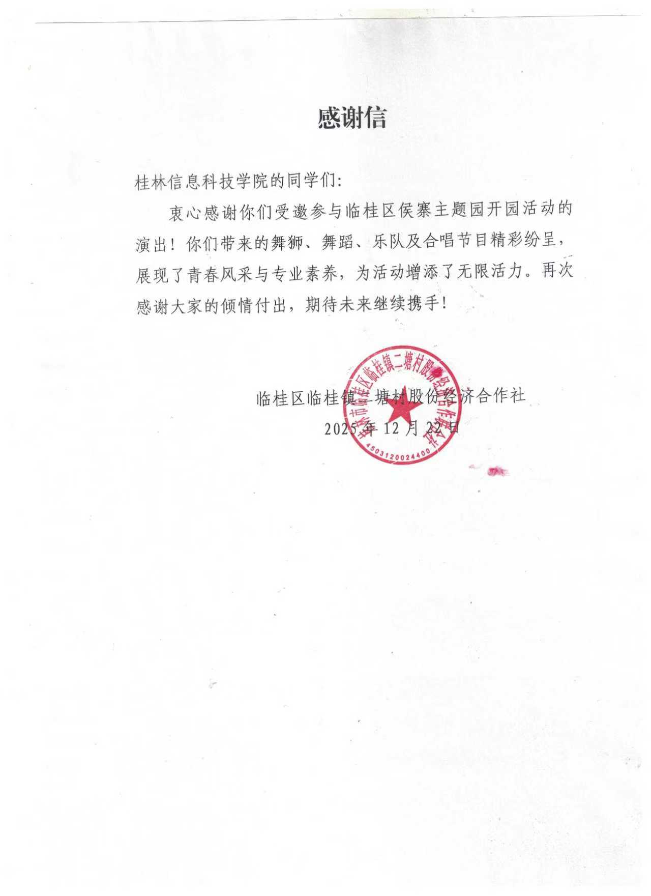 12月20日,临桂区侯寨村第二届盆景艺术节顺利举办。我校大学生艺术团与舞狮队以专业精湛的表演、昂扬饱满的精神面貌惊艳亮相,为这场乡村特色盛会注入蓬勃青春活力,充分展现出我校学子良好的综合素养与主动服务地方的责任担当。