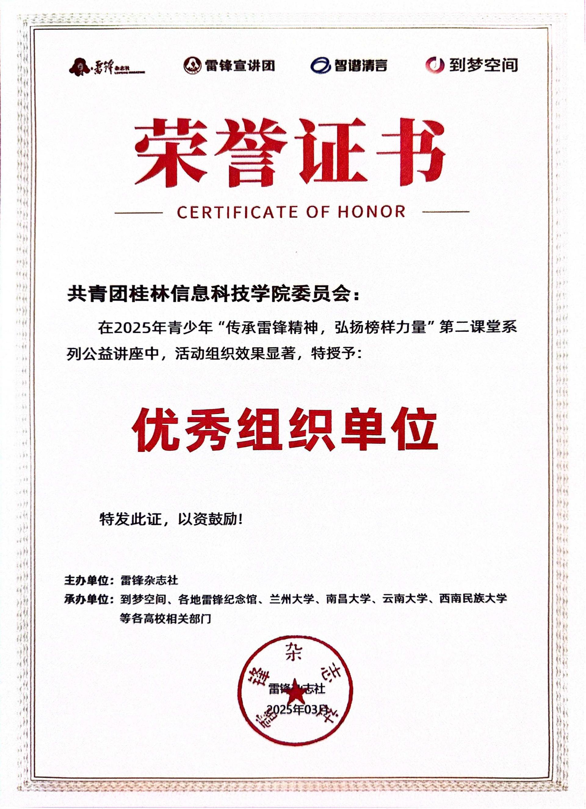 近日,桂林信息科技学院在第二课堂建设工作中传来捷报,凭借出色的活动组织能力与突出成效,荣获共青团中央“到梦空间”授予的两项荣誉——“2025年青少年‘传承雷锋精神,弘扬榜样力量’第二课堂系列公益讲座优秀组织单位”和“2025年大学生我身边的劳模工匠作品征集活动优秀组织单位”。
