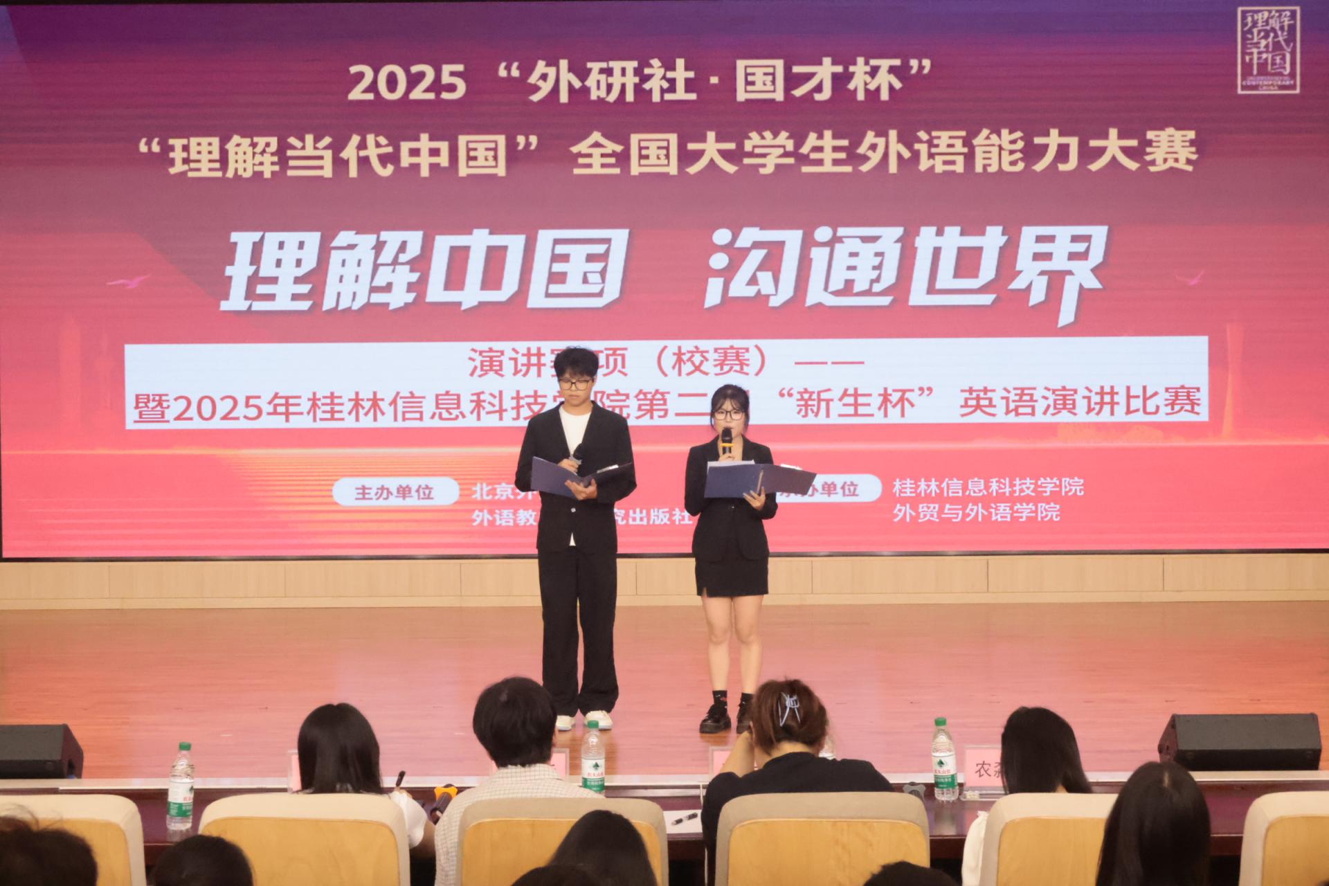 10月16日晚,由我校外贸与外语学院承办的2025年“外研社・国才杯”全国大学生外语能力大赛演讲赛项(校赛)暨2025年桂林信息科技学院第二届“新生杯”英语演讲比赛,在博文楼F107报告厅圆满落下帷幕。来自全校各院系的参赛选手齐聚一堂,以英语为桥,用青春之声诠释时代主题,展现了我校学子的外语素养与思辨风采。
