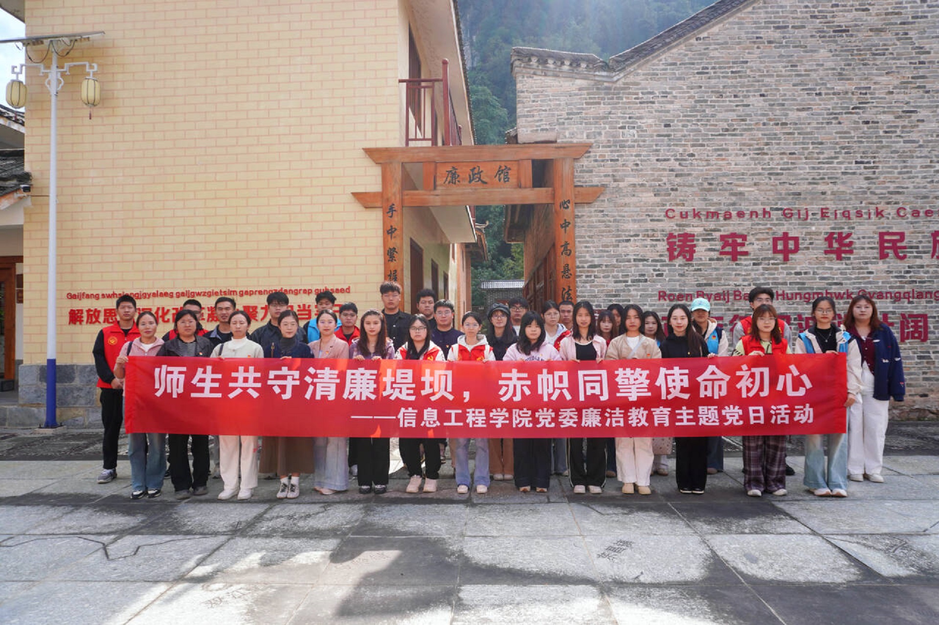 为深入学习贯彻习近平总书记关于党的自我革命的重要思想,巩固落实中央八项规定精神的学习效果,强化师生党员廉洁自律意识,筑牢拒腐防变思想防线,11月14日,信息工程学院党委组织师生党员代表40余人,赴荔浦市杜莫张村革命旧址“廉史镜鉴”廉政教育馆开展“师生共守清廉堤坝,赤帜同擎使命初心”廉洁教育主题党日活动。