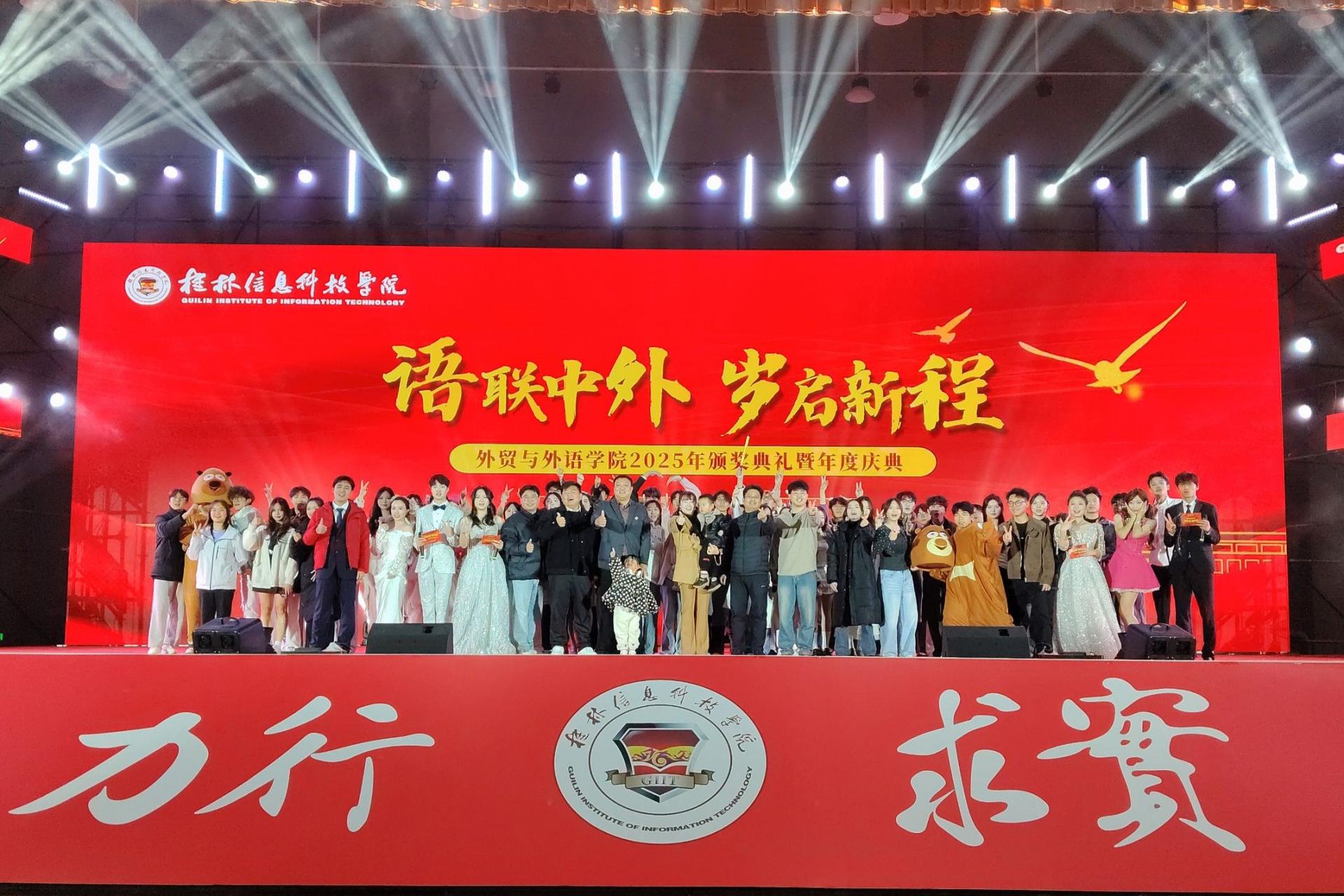 12月29日,桂林信息科技学院外贸与外语学院“语联中外,岁启新程”——2025年度晚会暨表彰大会在学校体育馆圆满落幕。学校学生发展与服务中心副主任蒋勇、学院党委书记廖星男、学院副院长赖安、学院党委副书记杨锦超、外贸与外语学院企业专家委员会委员阳朔欧美达英文书院院长欧达、副院长王学清、(英文部)校长阮卫元、人力资源经理雷吉祥、学院各办公室教师代表、历届校友及学院学生400余人齐聚行健楼,以特色文艺展演、重磅荣誉表彰,定格青春盛典,共启新程。