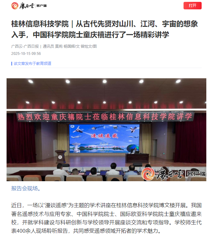 广西云-广西日报链接:桂林信息科技学院|从古代先贤对山川、江河、宇宙的想象入手,中国科学院院士童庆禧进行了一场精彩讲学