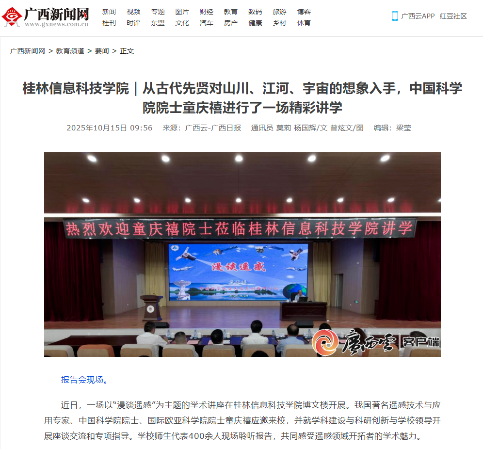 广西新闻网链接:桂林信息科技学院|从古代先贤对山川、江河、宇宙的想象入手,中国科学院院士童庆禧进行了一场精彩讲学