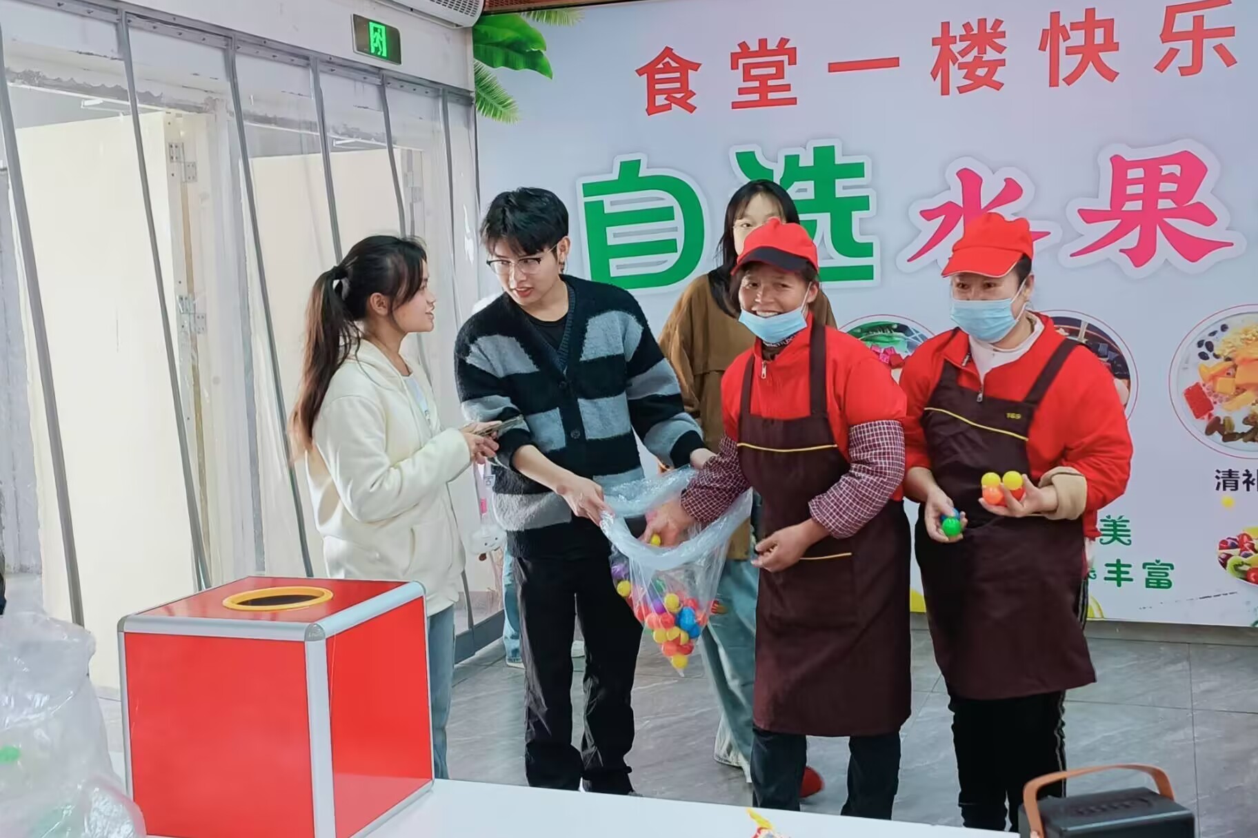 活动现场暖意融融,热气腾腾的饺子与香甜软糯的汤圆氤氲着冬至的烟火气。“集赞有礼”“游戏闯关”等趣味互动环节更是点燃了同学们的参与热情:大家纷纷分享活动动态至社交平台,凭点赞兑换创意礼品;在 “反向指令挑战”“小球投篮”“英语单词接龙” 等游戏中,同学们相互协作、踊跃交流。活动全程贯穿双语引导与文化解读,让传统节庆变身锻炼国际交往能力的生动课堂。