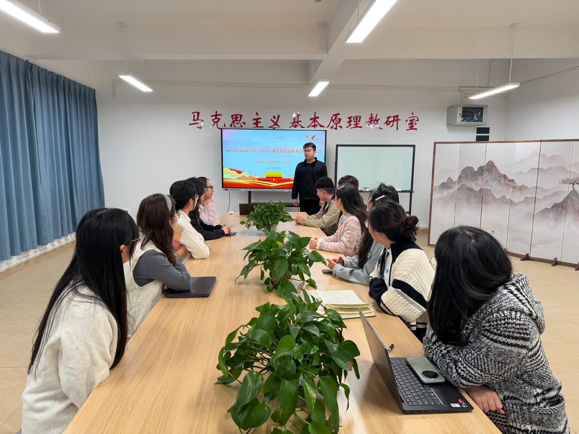 随后,支部以教研室为单位开展习近平总书记关于党的自我革命的重要思想专题学习研讨。各教研室结合思政课教学特点,重点探讨了如何将自我革命精神融入师德师风建设与课堂教学改革。大家一致认为,作为思政课教师,要带头践行自我革命精神,以更高标准要求自身,不断创新教学方法,提升育人实效,切实推动党的创新理论进教材、进课堂、进头脑。