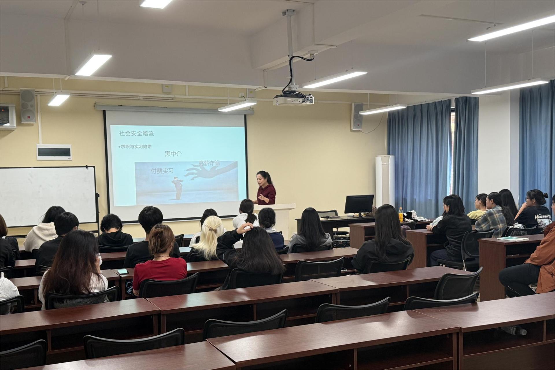 接下来,宋湘副教授围绕五大核心安全领域展开详细讲解。在求职与实习安全方面,重点揭露黑中介的常见欺诈手法,如虚假岗位宣传、收取高额中介费却不提供服务、扣押证件等,指导学生通过正规渠道寻找实习岗位,核实中介资质,签订书面协议,避免陷入求职陷阱;在财产安全方面,解析电信诈骗的典型套路,传授“三不一多” 防范原则;在人身安全方面,针对校园活动、校外出行等场景给出防护建议;在网络安全方面,强调个人信息保护与不良信息甄别;在心理安全方面,提醒学生关注情绪调节与心理求助渠道。