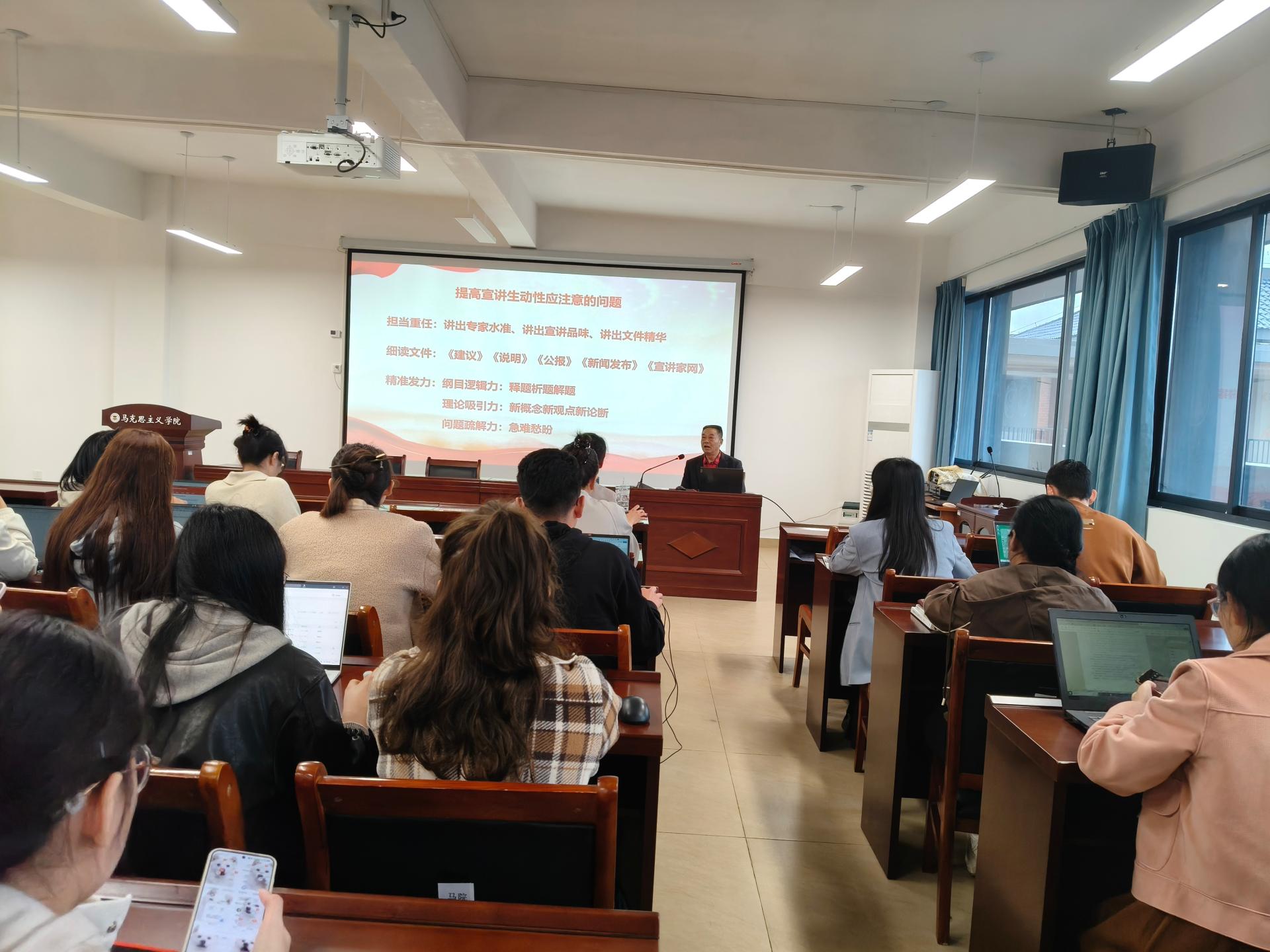 马克思主义学院党总支召开党的创新理论进基层理论宣讲备课会11月7日下午,马克思主义学院党总支在G605会议室召开党的创新理论进基层宣讲备课会,会议由党总支书记赵奕主持,理论宣讲团全体教师参加会议。备课会现场涂教授围绕“讲出专家水平、讲出宣讲品味、讲出文件精神...